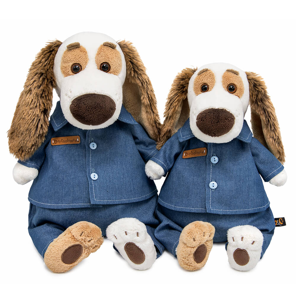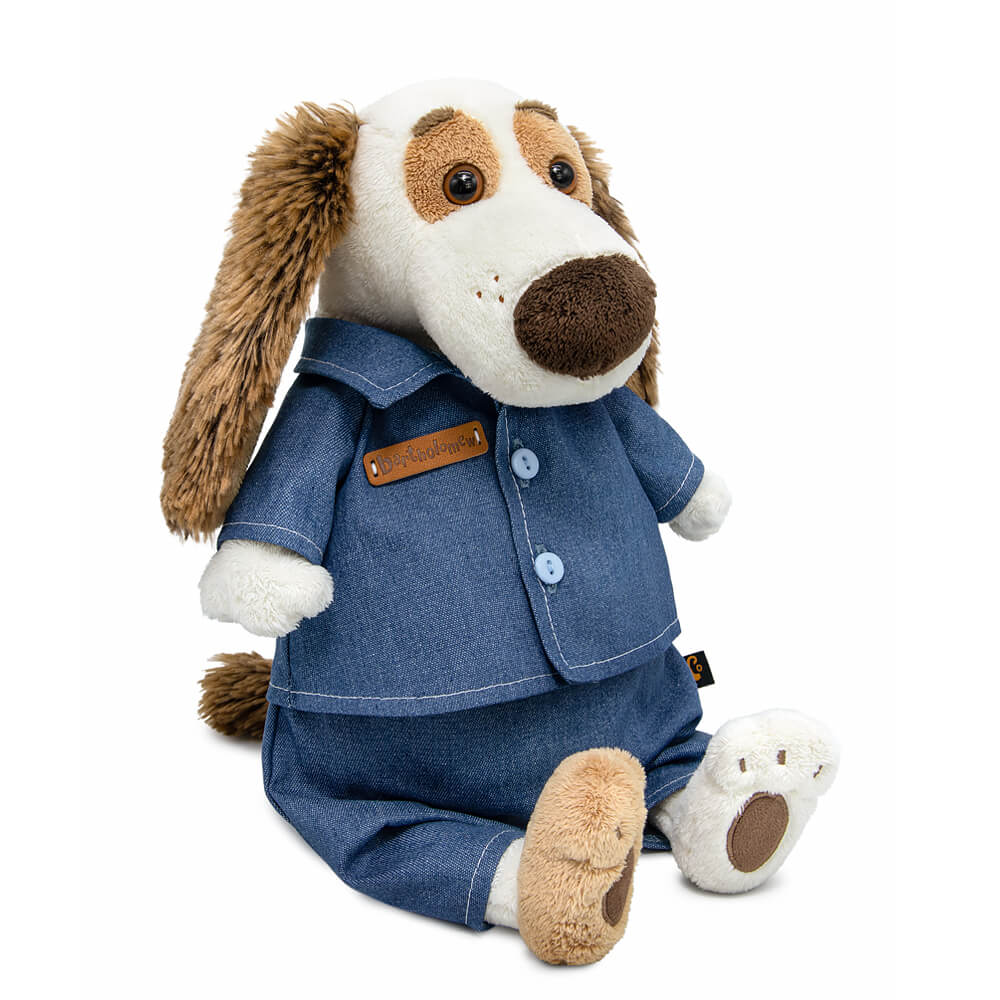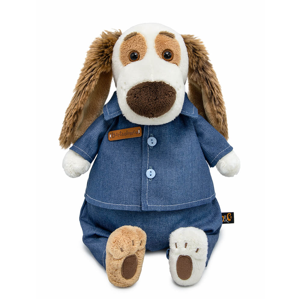 Бартоломей в лаконичном костюмчике из денима синего цвета с серым оттенком. Широкие брючки и курточка на голубых пуговках отделаны контрастной строчкой. Спереди на курточке лейбл с напечатанным именем.