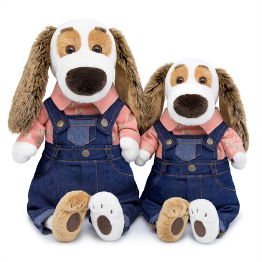 Бартоша в забавном костюмчике: классический комбинезон из синей джинсы с отворотами, кармашком на грудке и лямочками на кнопках, а также трогательная рубашечка из мягкой фланельки цвета абрикосового румянца с милым принтом - мордочки зайчиков.