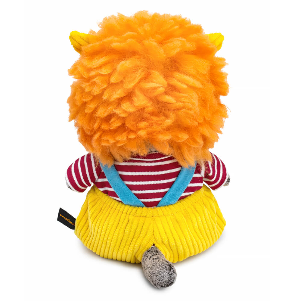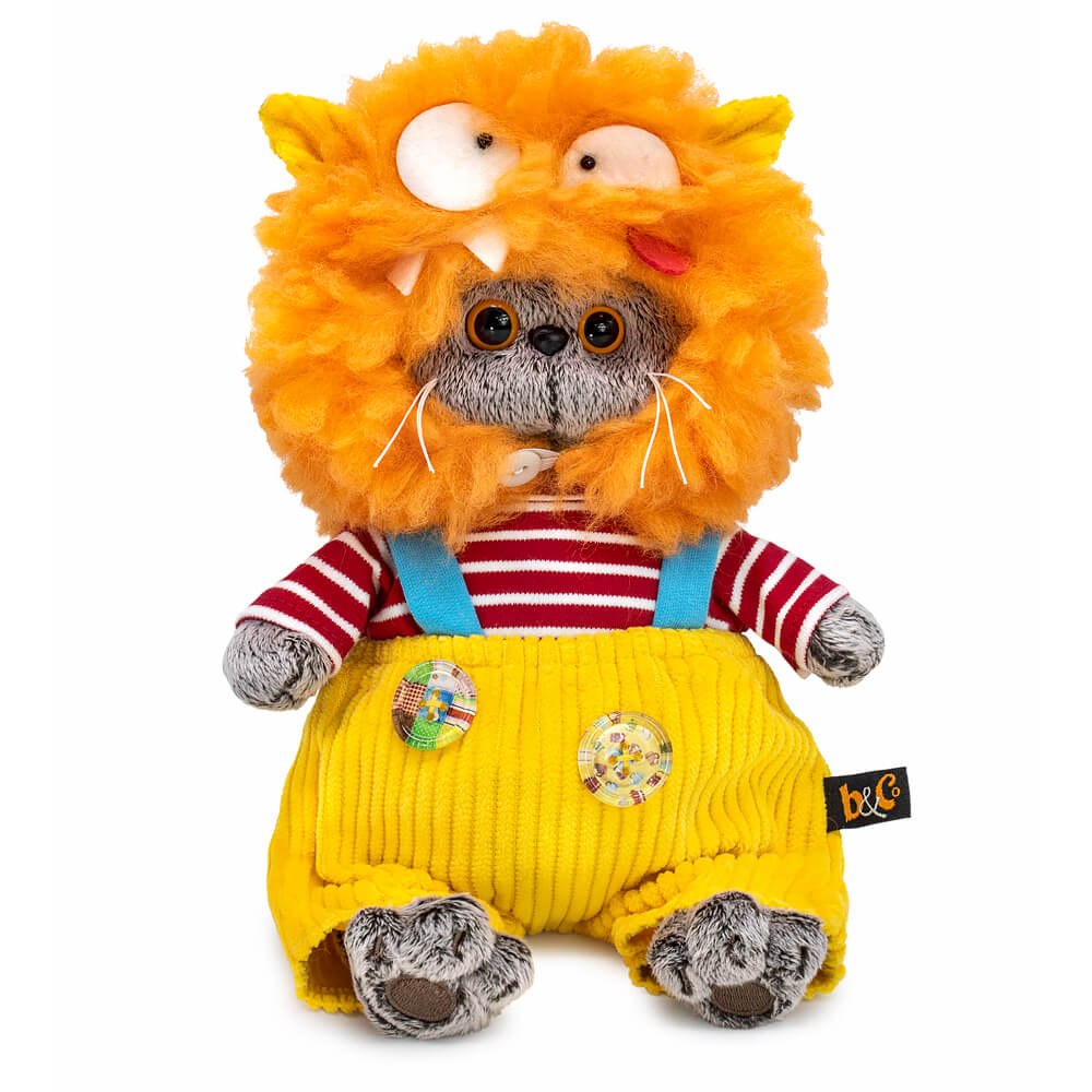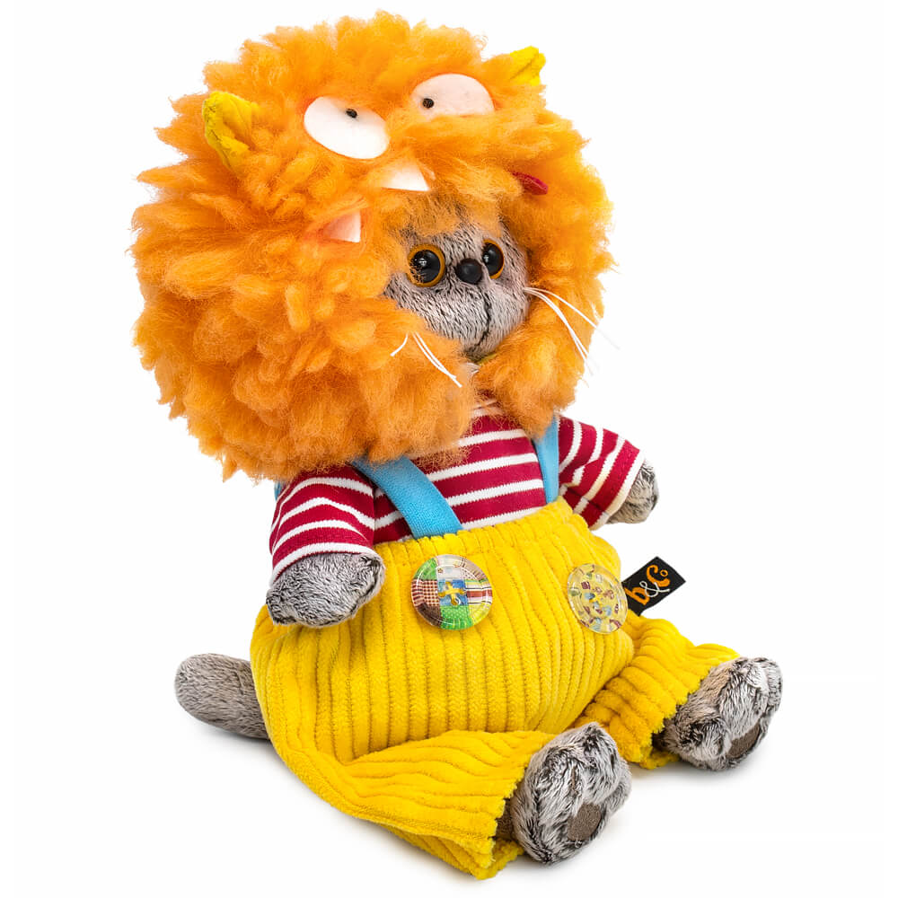 Кот Басик в забавной шапке «Монстрик». Шапка сшита из объёмного рыжего меха, с ушками из жёлтого софта и с застёжкой на пуговку. На шапке вручную собрана смешная мордочка монстрика. Также на Басике трикотажный лонгслив в бело-красную полоску и жёлтенькие штанишки из вельвета на голубых лямочках. Штанишки спереди украшены большими пуговицами с принтом.