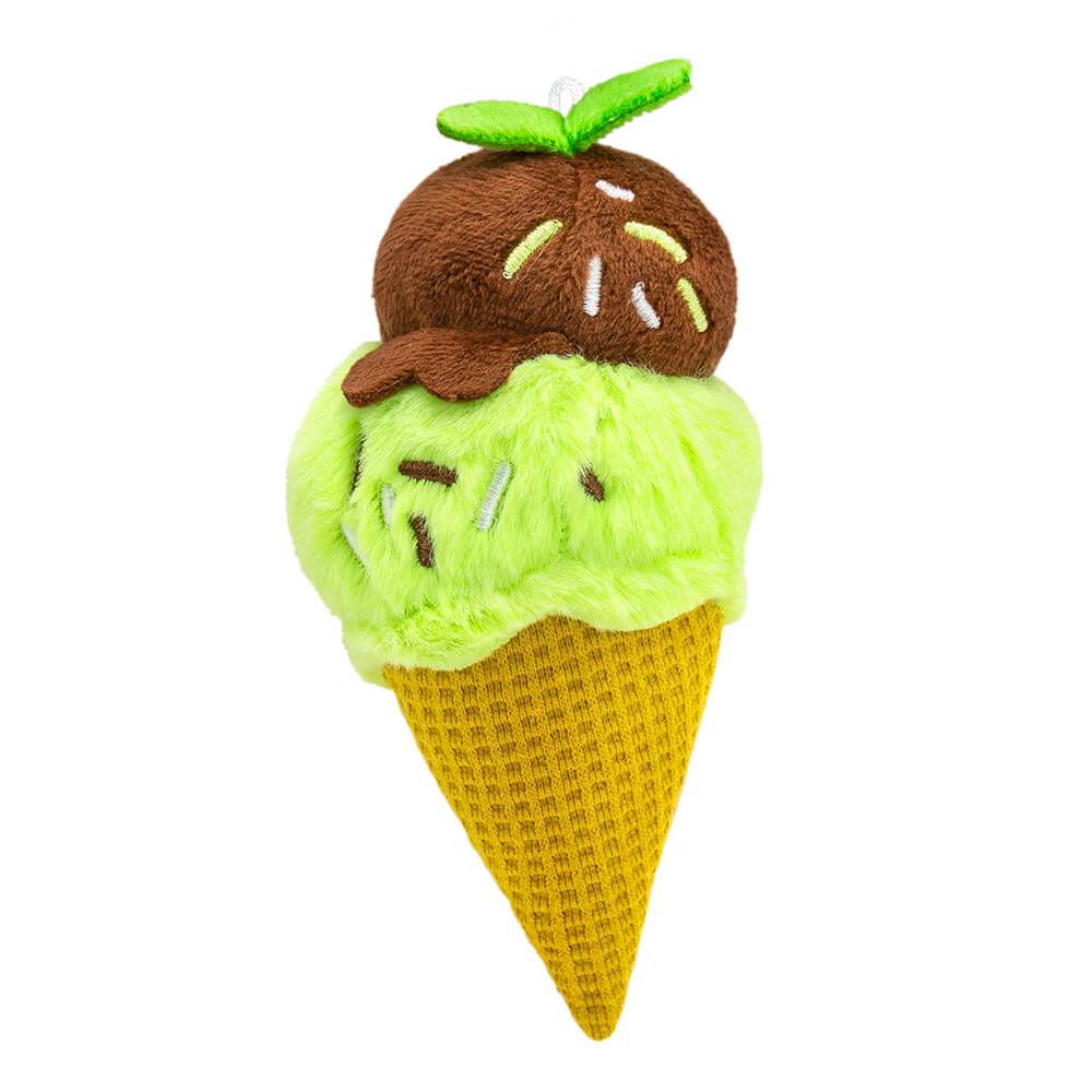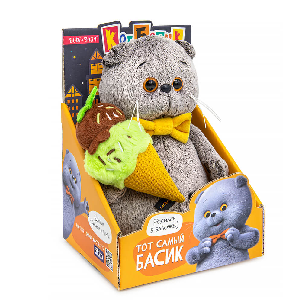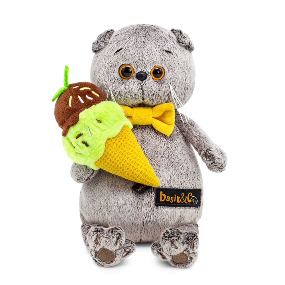 В лапке Басик держит аппетитное фисташковое мороженое. Мороженое сшито из софта цвета фисташки и вафельной ткани цвета печенья, имитирующей вафельный рожок. Сверху мороженого шоколадный шарик с мятным листочком. Мороженое украшено вышитой карамельной посыпкой. А на самом Басике его фирменный галстук бабочка.