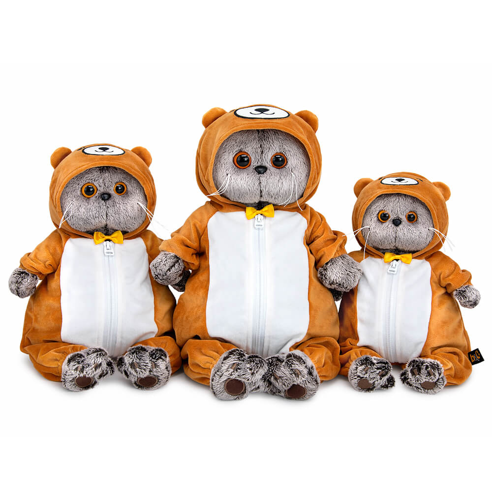 Кот Басик в милом кигуруми «Медвежонок». Кигуруми сшито из нежного софта карамельного цвета со вставкой из молочного софта. На капюшоне аппликация с вышивкой в виде мордочки медвежонка. Низ рукавов и штанишек на резиночках, спереди кигуруми застёгивается на зип-молнию. На шее у Басика его любимый галстук-бабочка.