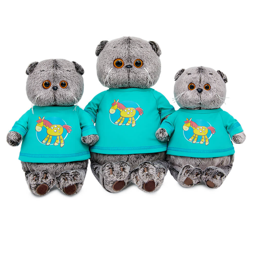 Кот Басик в мягком лонгсливе из х/б трикотажа цвета бирюзовой пастилы, с отделкой распошивочным швом синего цвета. Спереди на лонгсливе термонаклейка с авторским рисунком в виде трогательной жёлтой лошадки, символом года 2026.