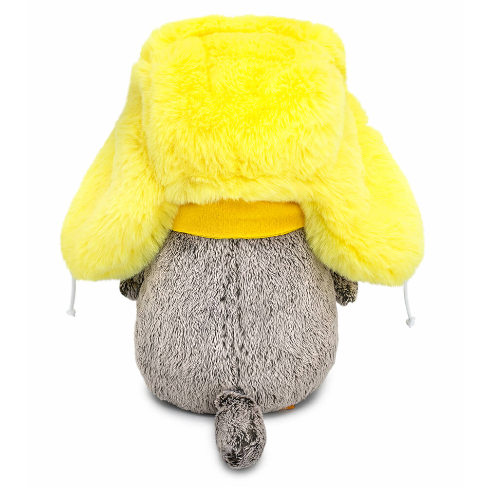 Кот Басик в шикарной шапке ушанке из высокого меха цвета бананового суфле. Шарфик из жёлтого флиса с бахромой на концах и пришитым фирменным лейблом.
