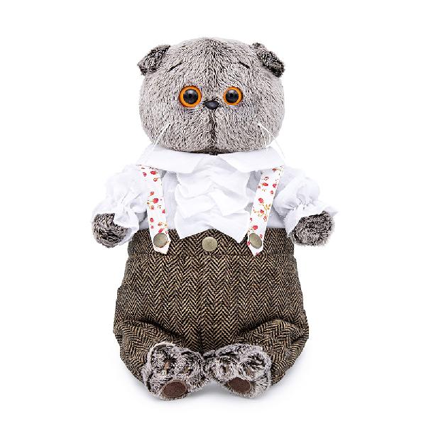 Кот в невероятно романтичном комплекте – белой рубашечке с жабо и пышными рукавами, коричневых штанишках с трогательными подтяжками с розочками. Рубашечка из тонкого хлопка с выработкой, штанишки из плотного твида в ёлочку и подтяжки из репсовой ленты на металлических кнопках.