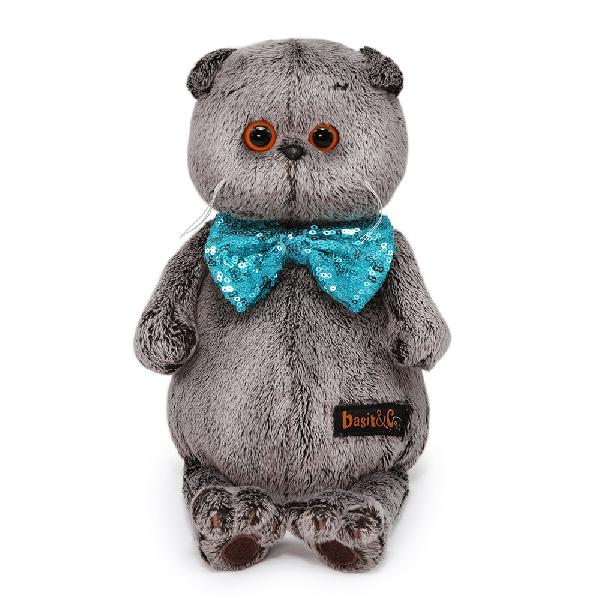 На Басике торжественный бант-бабочка из ткани с пайетками.