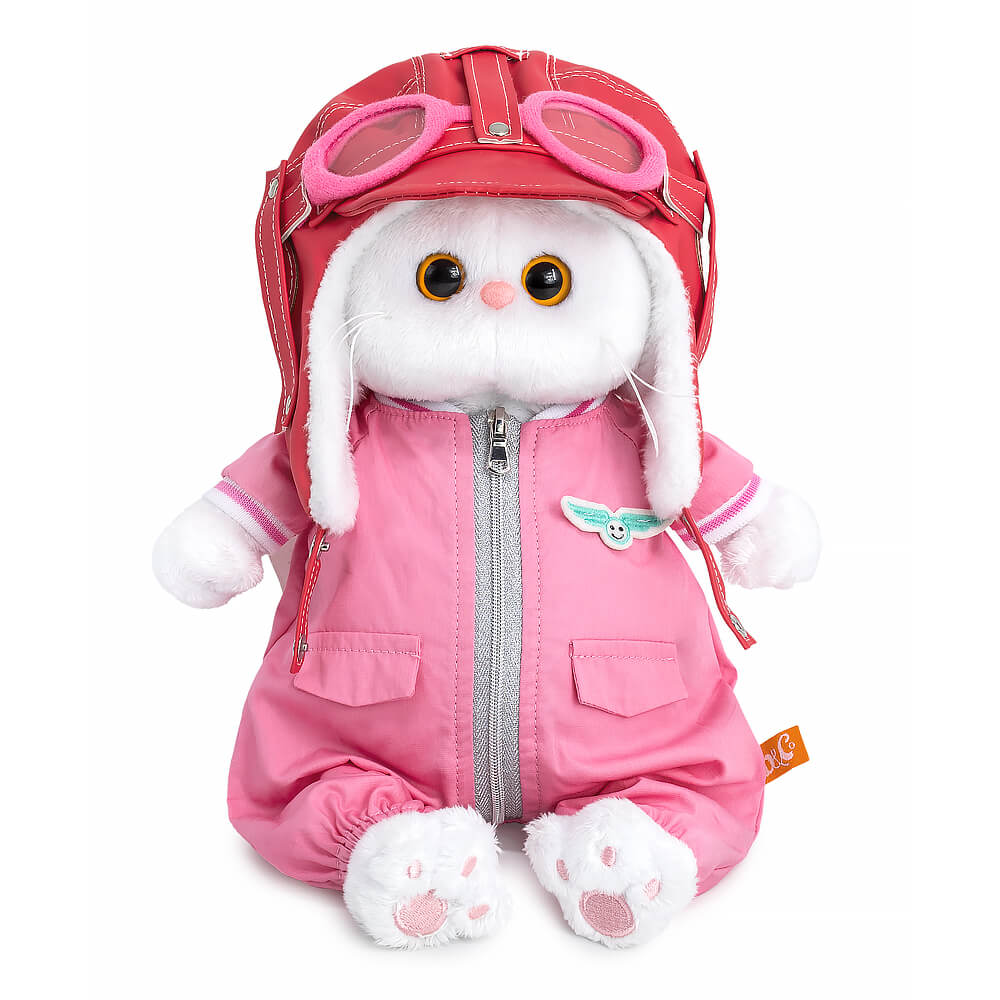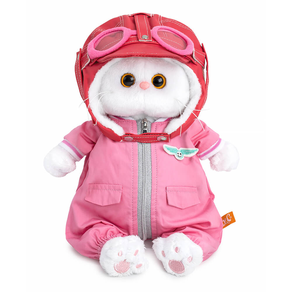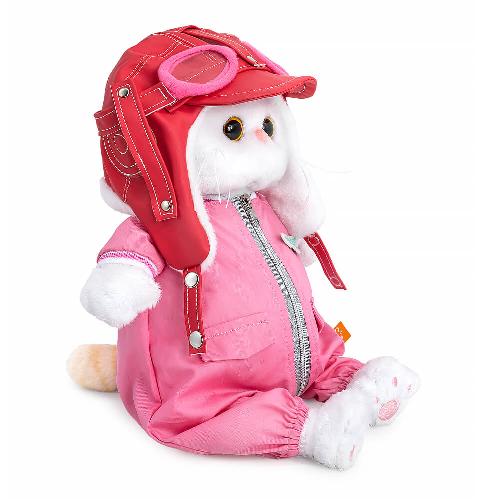 Кошечка Ли-Ли в суперстильном лётном костюме. На кошечке лётный комбинезон розового цвета, по горловине и низу рукавов отделан декоративной тканой резинкой с розовой полоской. Комбинезон сшит из плотного хлопка, с двумя клапанами спереди и с застёжкой на серебристую молнию. Спереди комбинезон украшает нашивка в виде крыльев. Также на Ли-Ли крутой лётный шлем, сшитый из эко-кожи ало-розового цвета с подкладом из белоснежного меха. Шлем отделан контрастной строчкой и ремешками с серебристыми клёпками. На шлем прикреплены специальные лётные очки с оторочкой из эко-замши ярко-розового цвета.