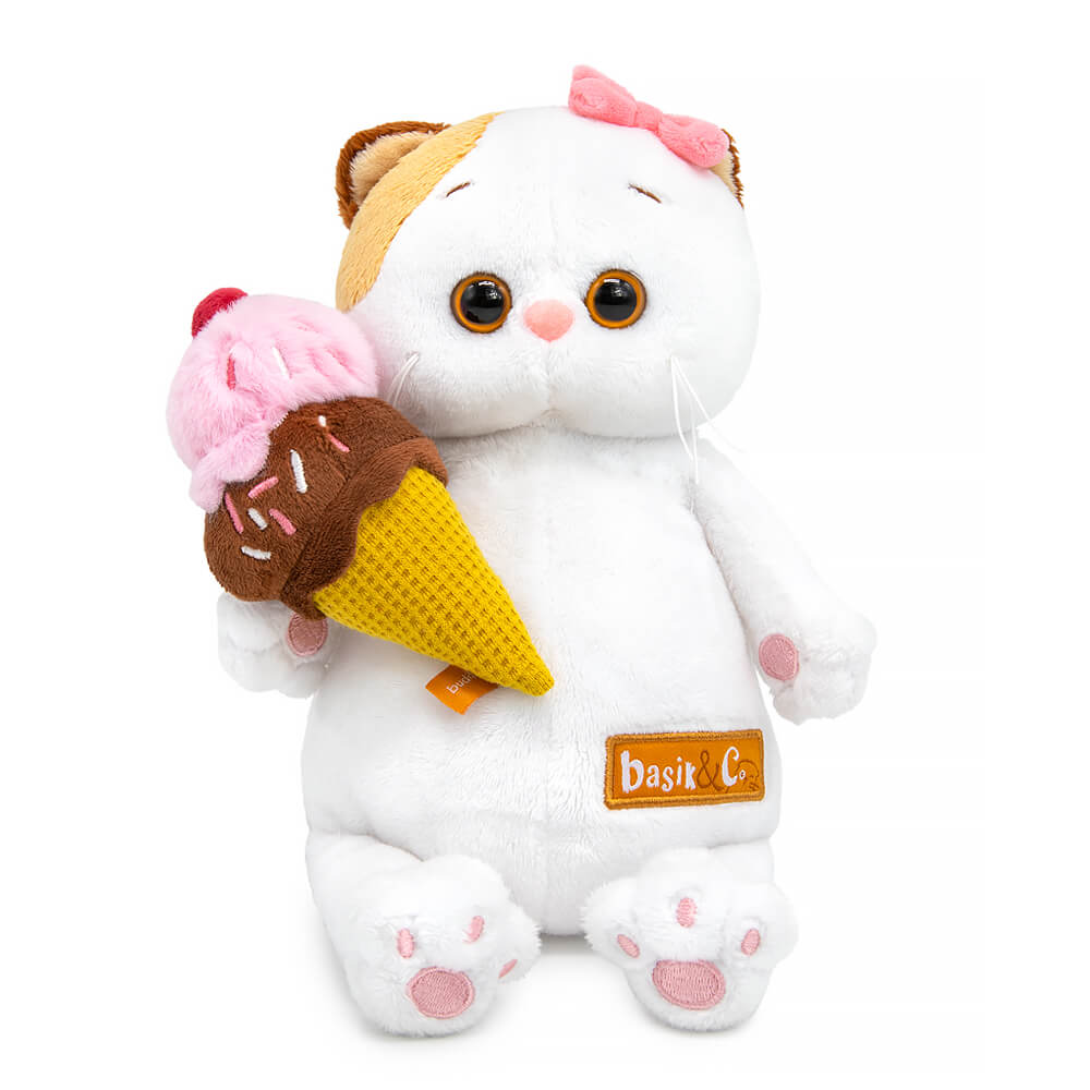 Кошечка Ли-Ли держит в лапках вкусный аксессуар – двойное мороженое. Мороженое сшито вручную из вафельной ткани цвета печенья, имитирующей вафельный рожок. Два шарика мороженого выполнены из софта шоколадного и клубничного цветов. Посыпка на шариках вышита разноцветными шёлковыми нитками. Сверху небольшая ягодка из софта. На ушке Ли-Ли её любимый розовый бантик.