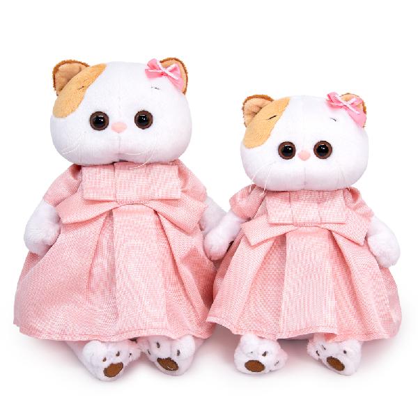Ли-Ли в шикарном цвета розовой воды платье из шелковистого крепа с люрексом. Платье сшито с коротким рукавом, отрезным по талии и встречными складками на юбке. Спереди платье украшено объемным декоративным бантом. На ушке у Ли‑Ли двойной бантик из розовой и серебристой ленточек.