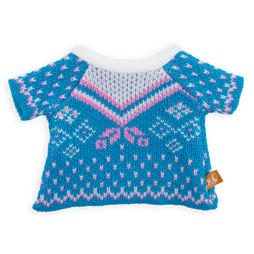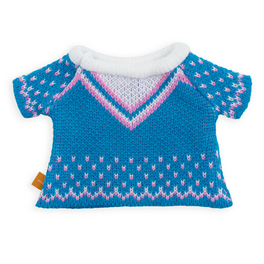 Удлиненный свитер интересной вязки с узором. Свитер связан из нежного акрила в голубых и розовых оттенках с небольшой белоснежной стоечкой.