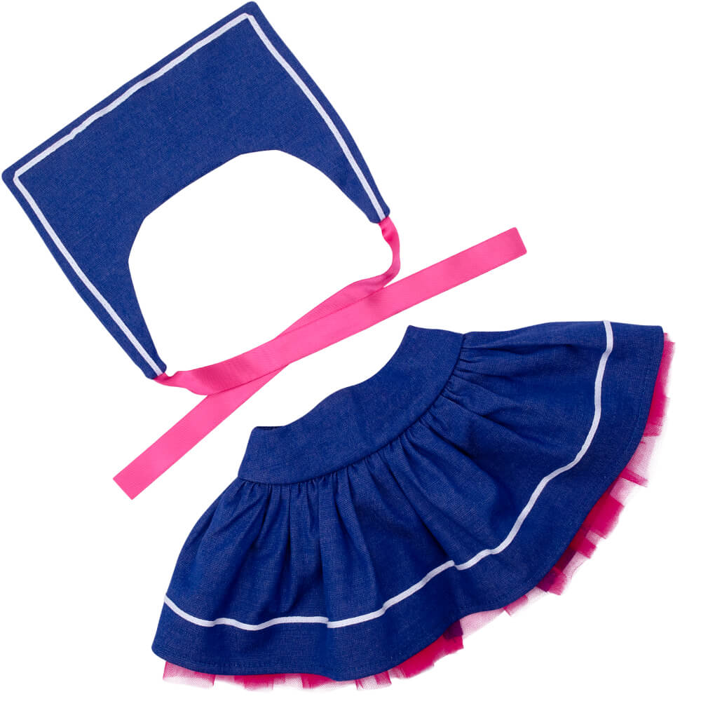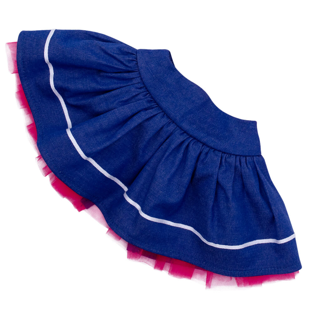 Красивое платье в морском стиле. Сшито из плотного хлопка морского синего цвета, отделано по вороту и по подолу белой тесьмой. Платье сшито с пышной нижней юбочкой из розовой сеточки. Спереди платье украшает атласный бант цвета розовой азалии.