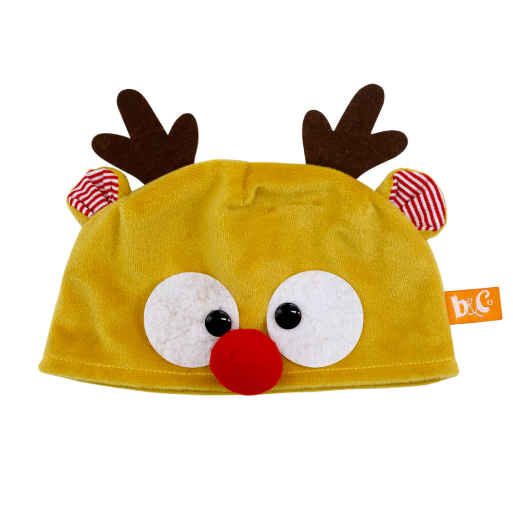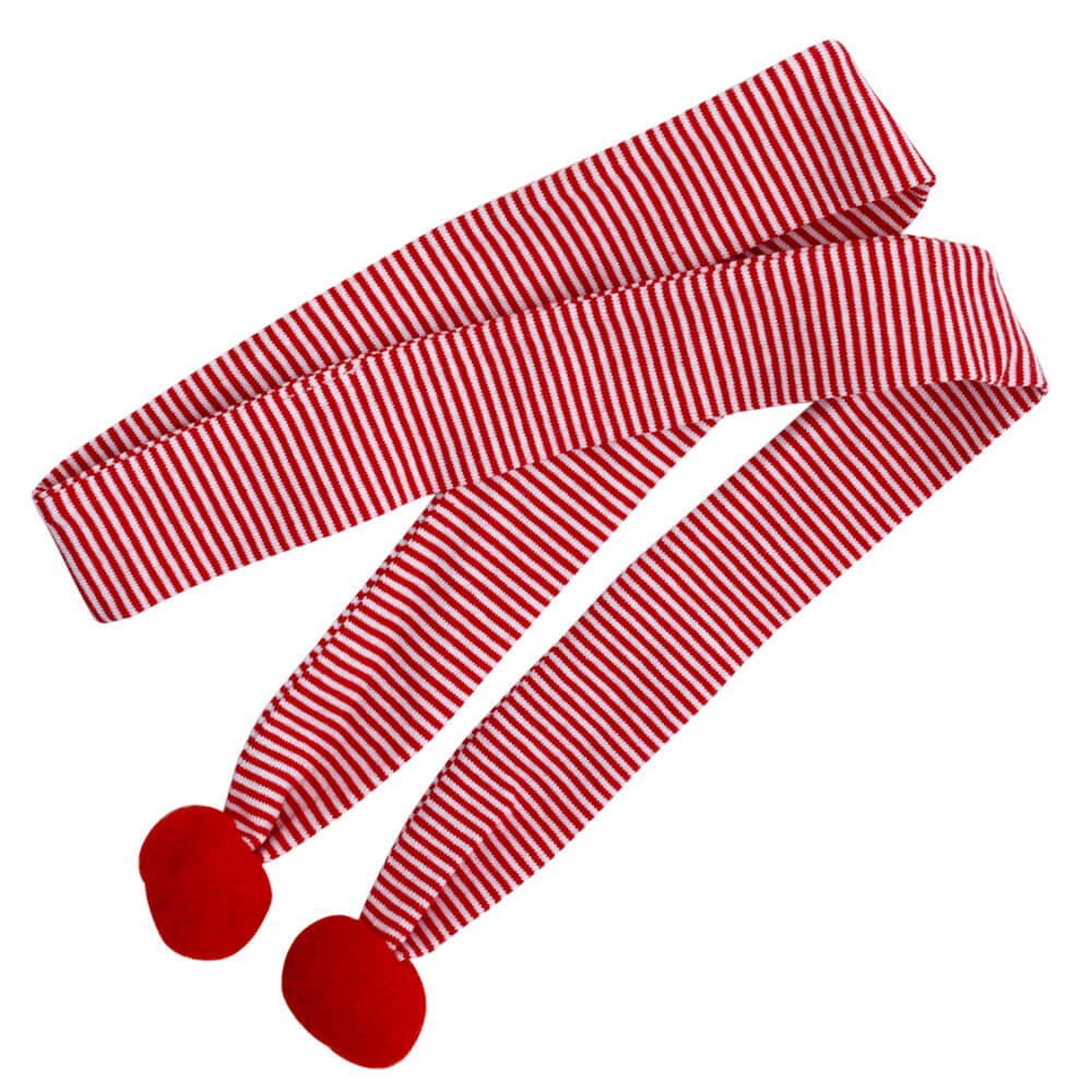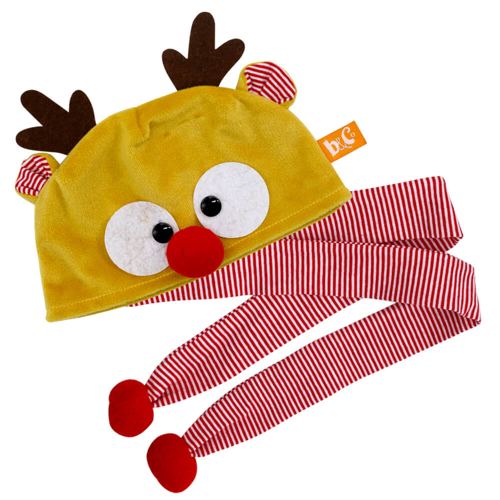 Оригинальный колпак. Шапочка оленя из мягкого охристого софта, с глазками из фетра и алым носиком—помпоном. Также тонкий, длинный шарфик из полосатого, в красно‑белую полоску трикотажа с красными помпонами на концах.