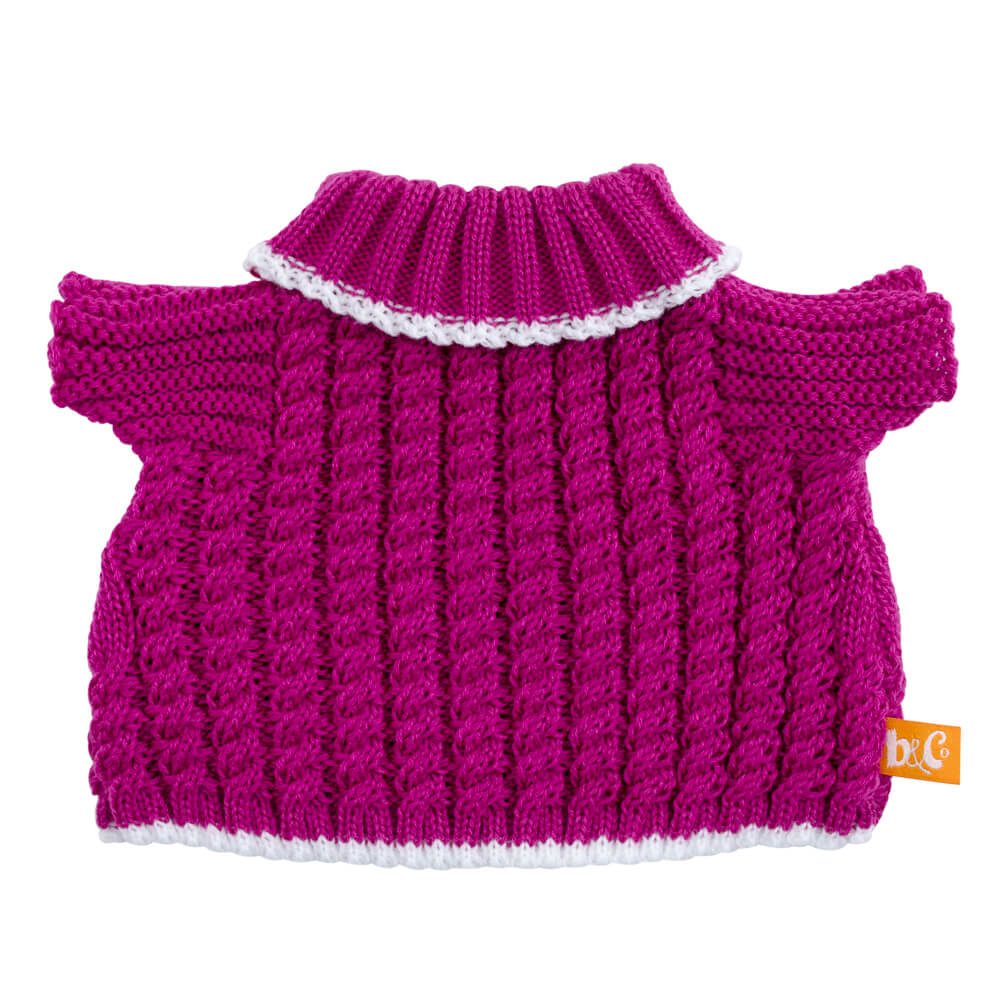 Удлиненный свитер красивого ягодного цвета. У свитера по низу и по воротнику идет узкая белая полоса.