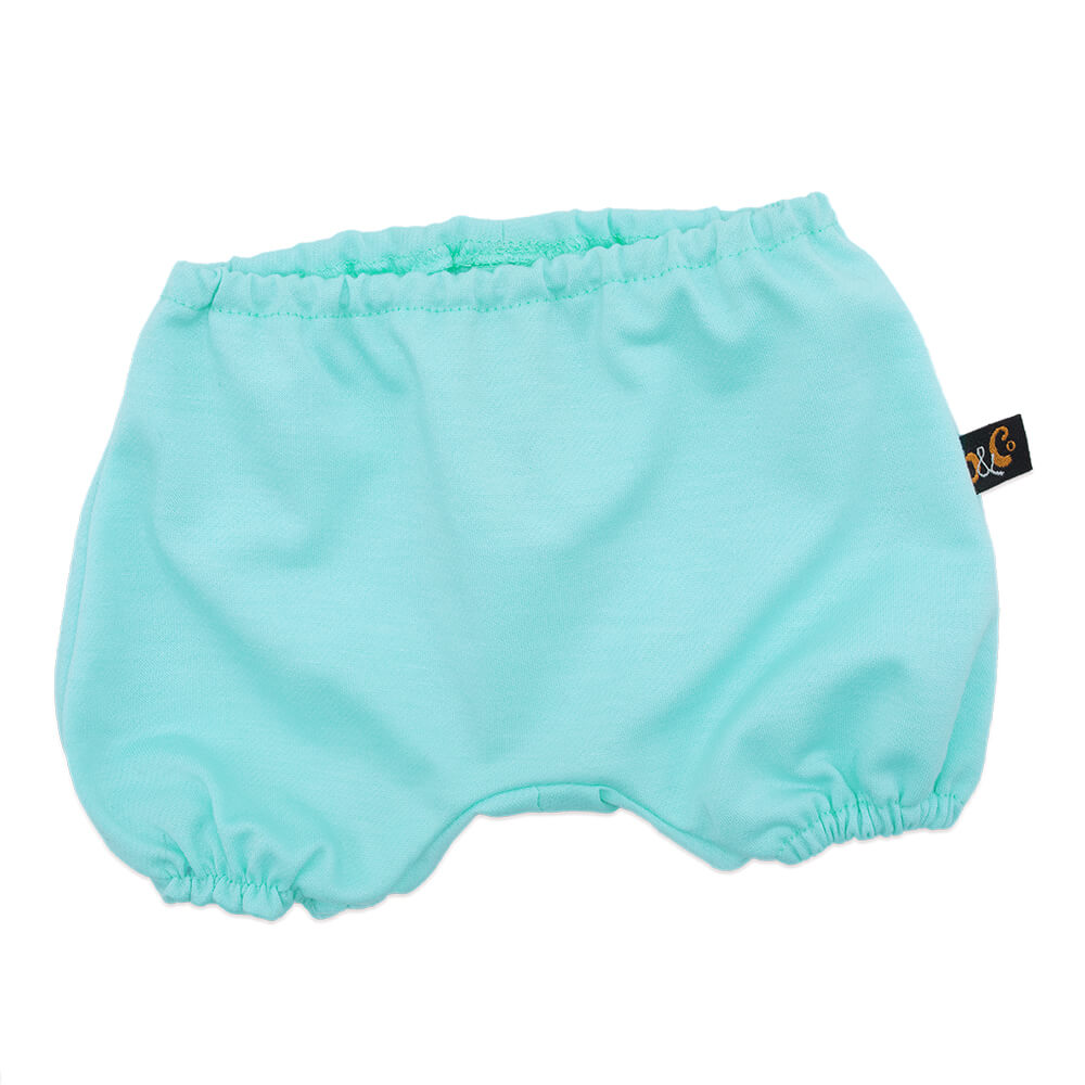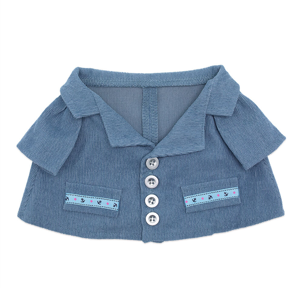 Пиджак сшит из очень мягкого микровельвета цвета голубой дали, застегивается на серебристые пуговки, а на листочках забавная тесьма с якорями. В комплекте бирюзовые широкие штанишки на резиночках. Также в комплекте белая маечка из