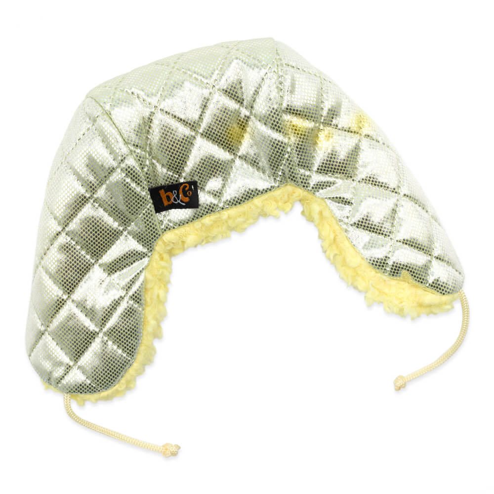 Модная шапка из стеганой болоньи с красивым блеском. Шапочка сшита на меховом подкладе лимонного цвета, с удлиненными ушками и с завязками из