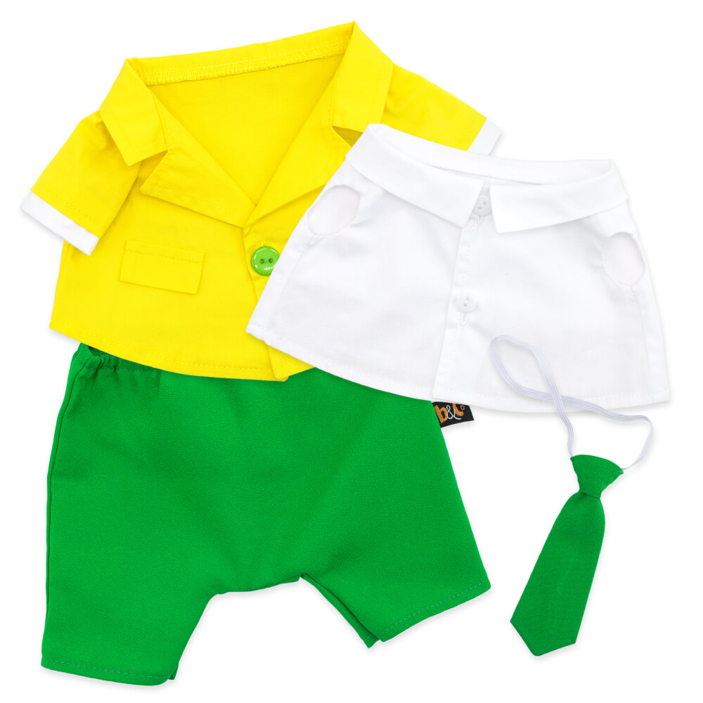 Классный яркий костюм в оттенках лета. В комплектацию костюма входят лимонный классический пиджак из плотной ткани на одной зелёной пуговке, ярко-зелёные брюки, белоснежная рубашка и зелёный галстук в тон брюк.