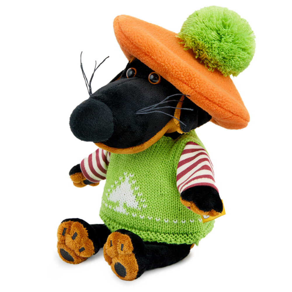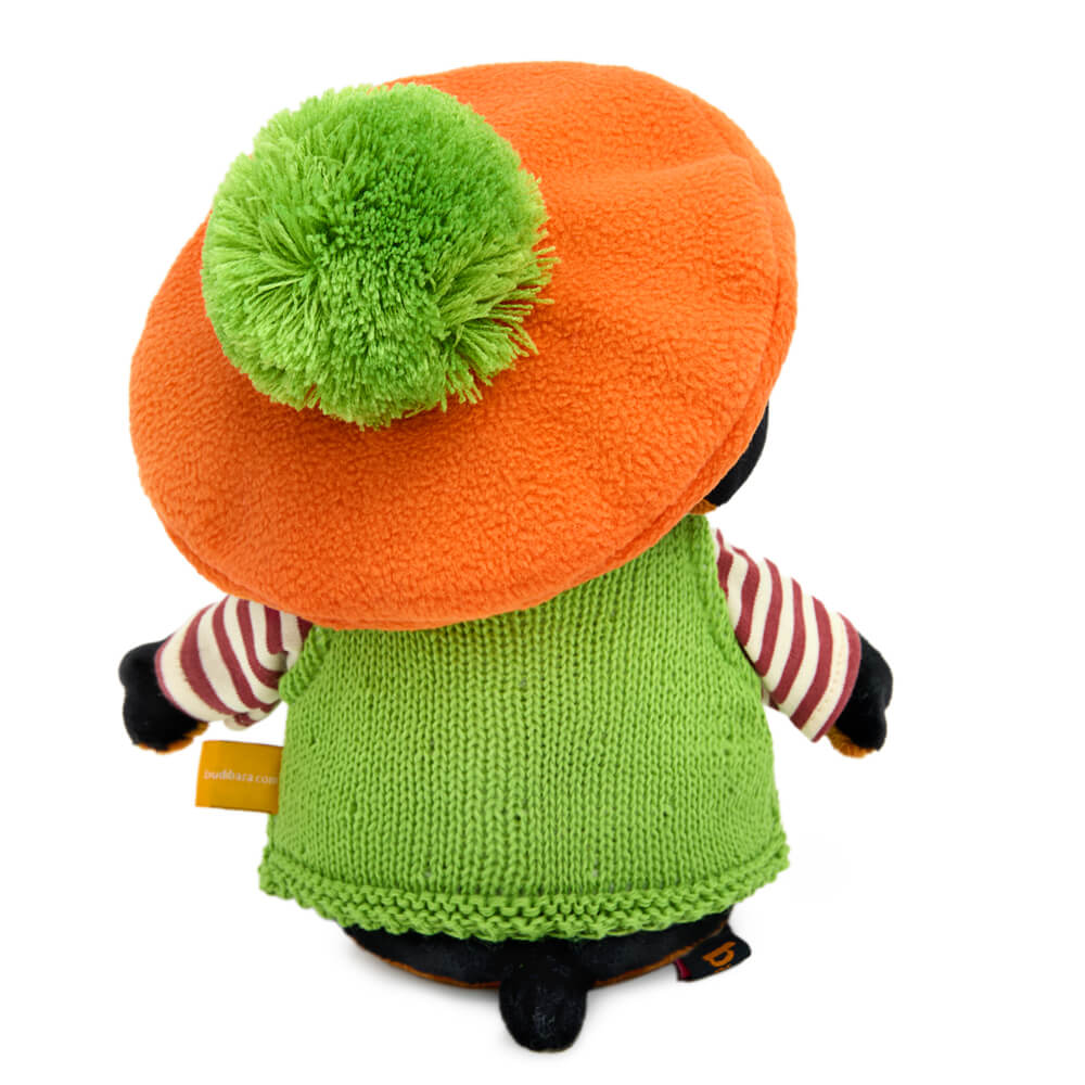 Малыш Ваксон в ярком, вязаном жилете из акрила цвета зелёного лайма с пришитыми рукавами из х/б трикотажа в терракотово-белую полоску. Спереди на жилете белыми нитками вывязано милое деревце. Также на Ваксоне объёмный берет из золотисто-оранжевого флиса с большим лаймовым помпоном из пряжи.