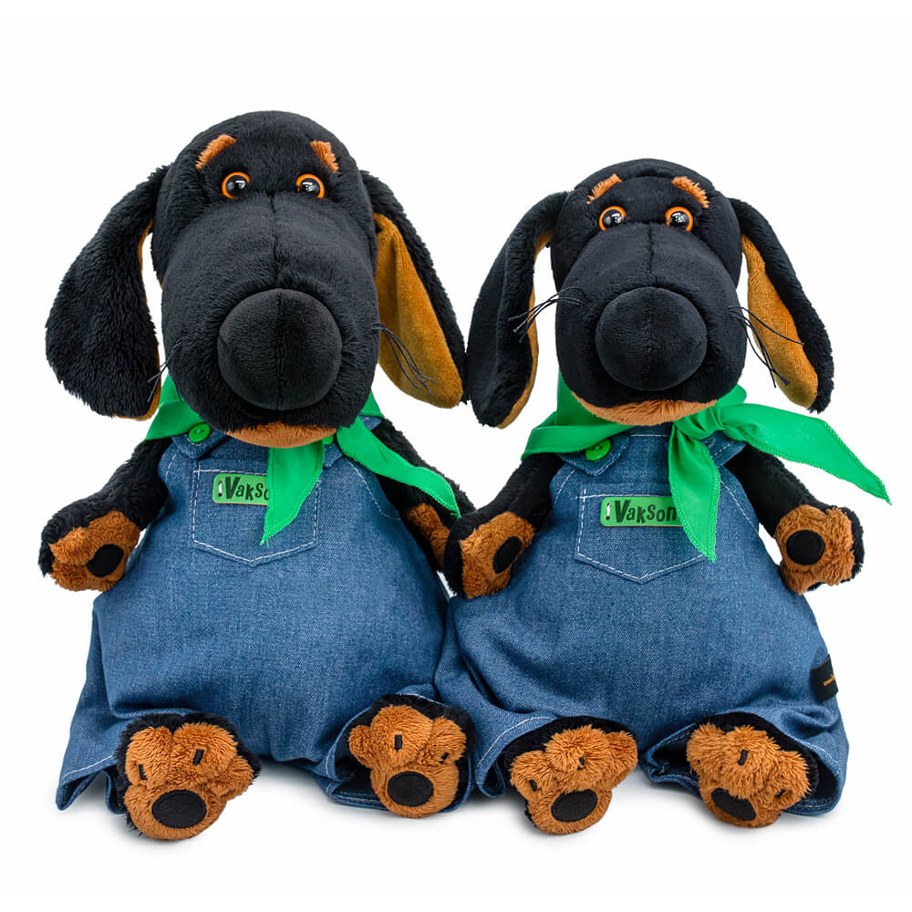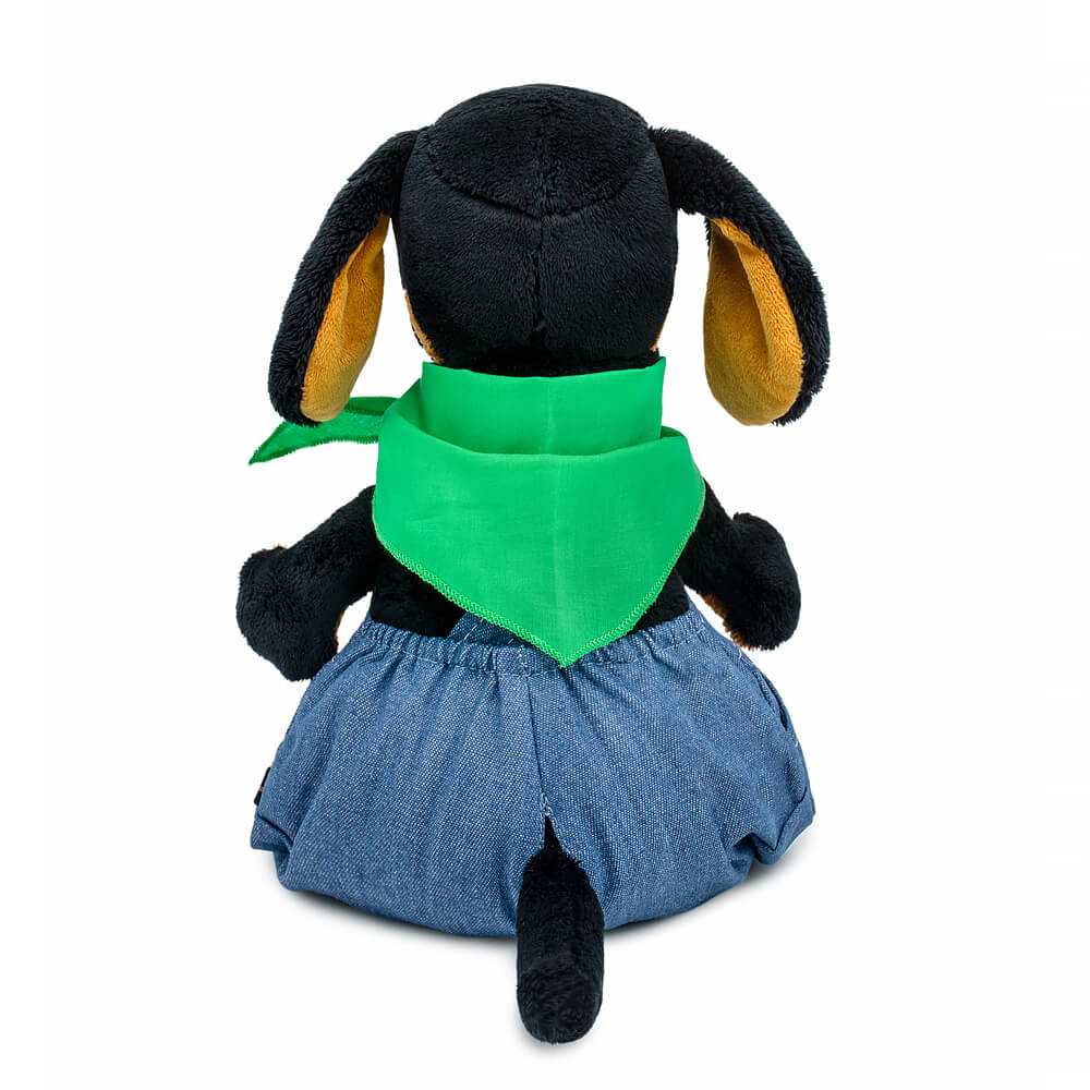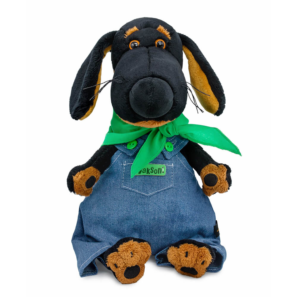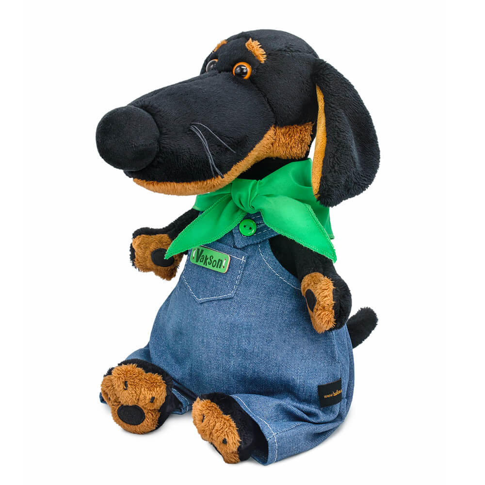 Ваксон в крутом комбинезоне на лямочках с ярко-зелёными пуговками. Комбинезон сшит из денима синего цвета с серым оттенком, с широкими штанинами и нагрудным кармашком с зелёным лейблом с именем. Комбинезон отделан контрастной строчкой. На шее у Ваксона платочек ярко-зелёного цвета, сшитый из нежного сатина.