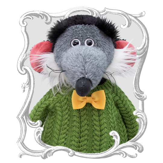 Крыса Фред в уютном, связанном косами свитере из акрила зелёного травяного цвета. Свитер украшает галстук бабочка из широкой репсовой ленты цвета бананового крема.
