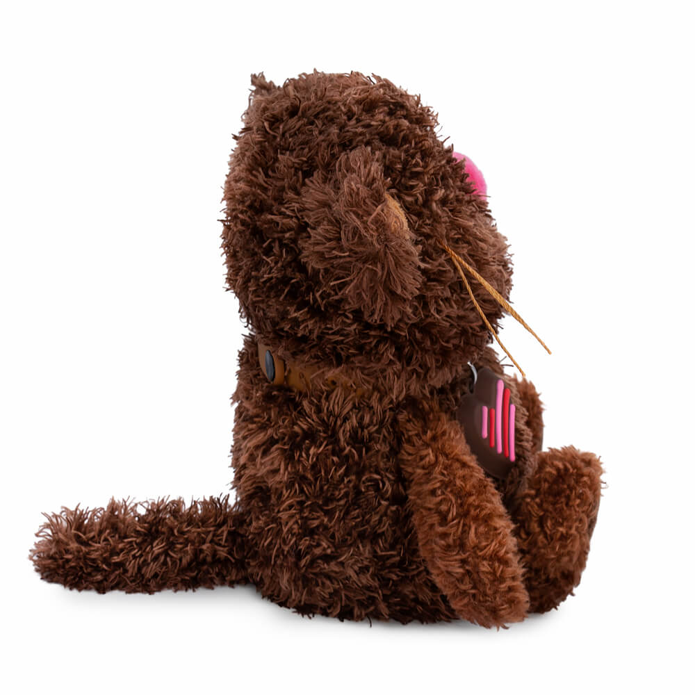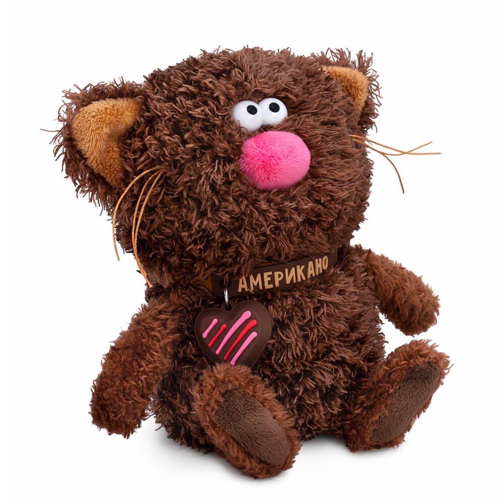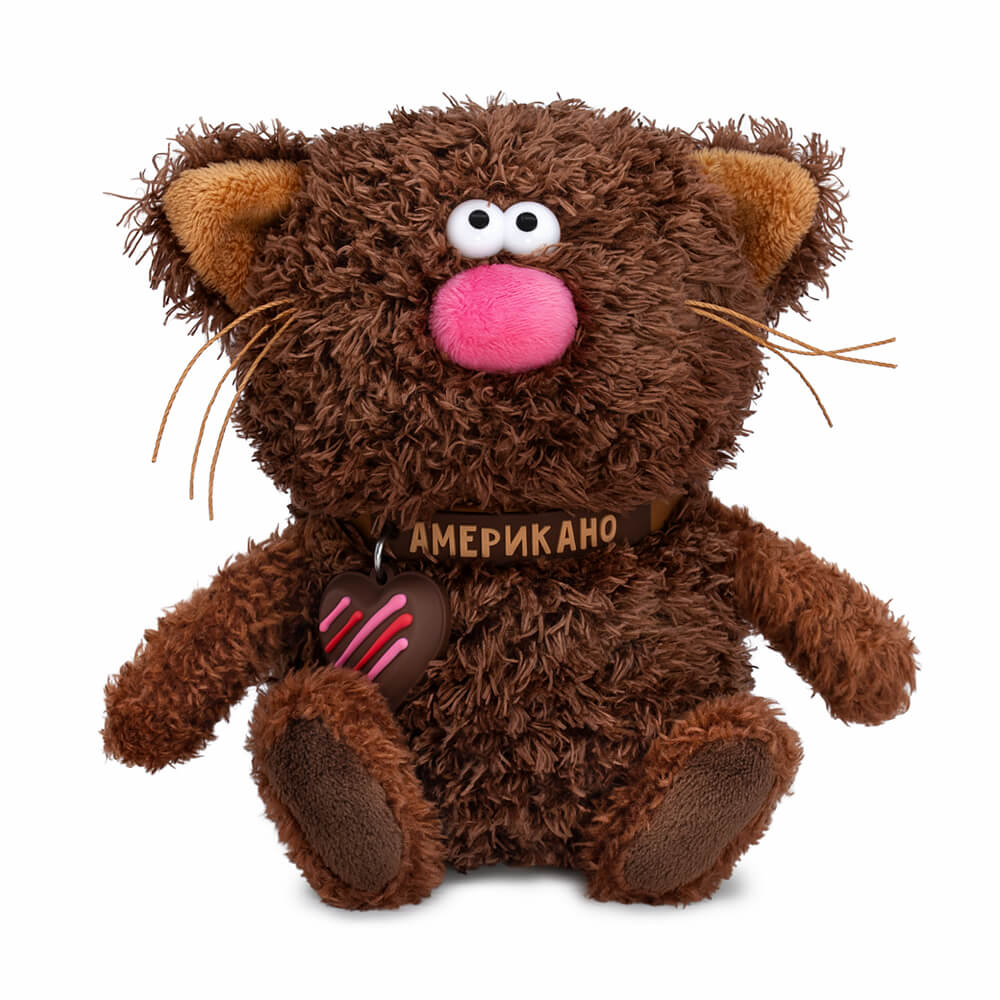 Очаровательный котик Американо из тактильно приятного экомеха цвета крепкого кофе в миниатюрном размере 12 см. Лапки и хвостик из более короткого меха. Усики из шелковистого крученого шнура. Объемный носик обтянут розовым софтом. Глазки из пластика. Пяточки из шоколадного софта, а внутри ушек софт цвета жженого сахара. На шейке у котика силиконовый чокер с названием и небольшим подвесом в виде шоколадки сердечка.