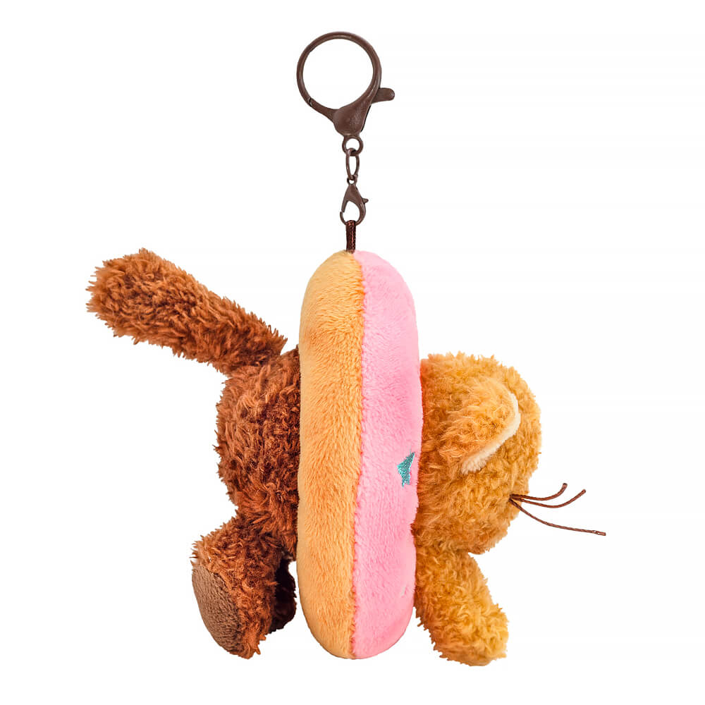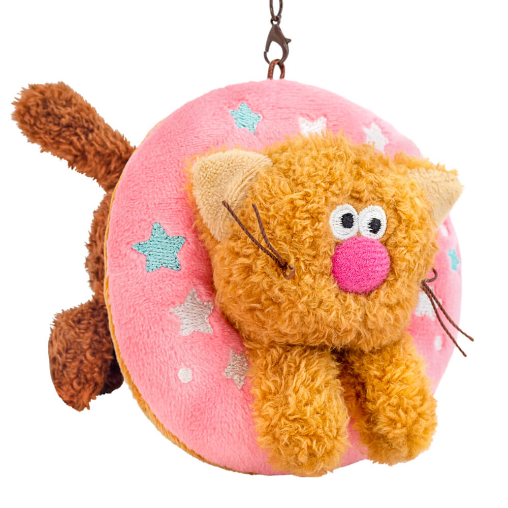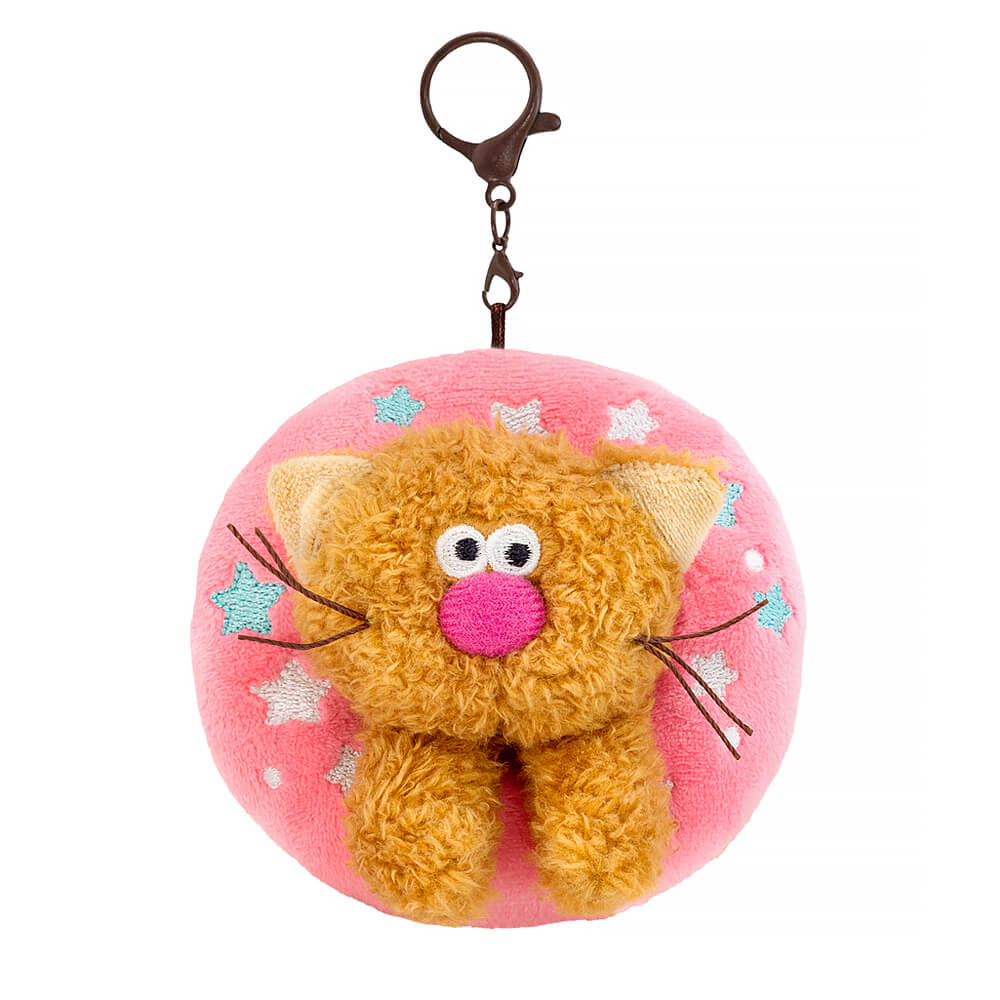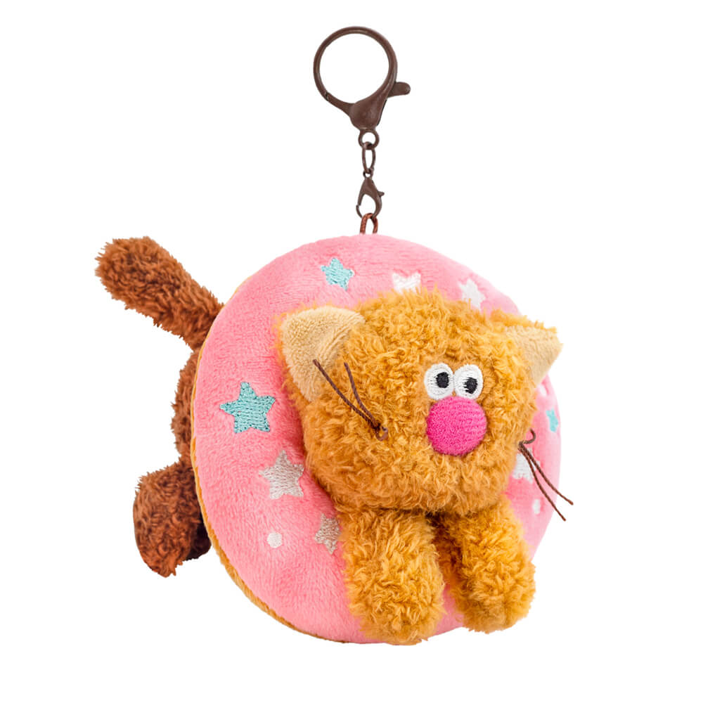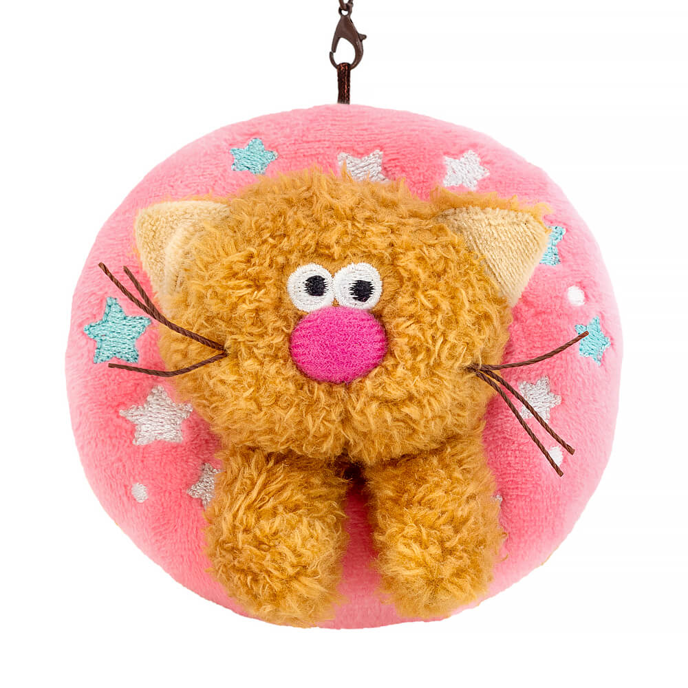 Забавный брелок в виде милого котёнка Кортадо из тактильно приятного эко меха в двух оттенках: шоколадного цвета и цвета песочного печенья. Котёнок расположился в пышном пончике, сшитом из нежного софта. Сам пончик цвета выпечки, а сверху крем цвета розовой помадки с вышитыми карамельными звёздочками. У брелока удобный карабин шоколадного цвета с застежками, который можно отстегнуть.