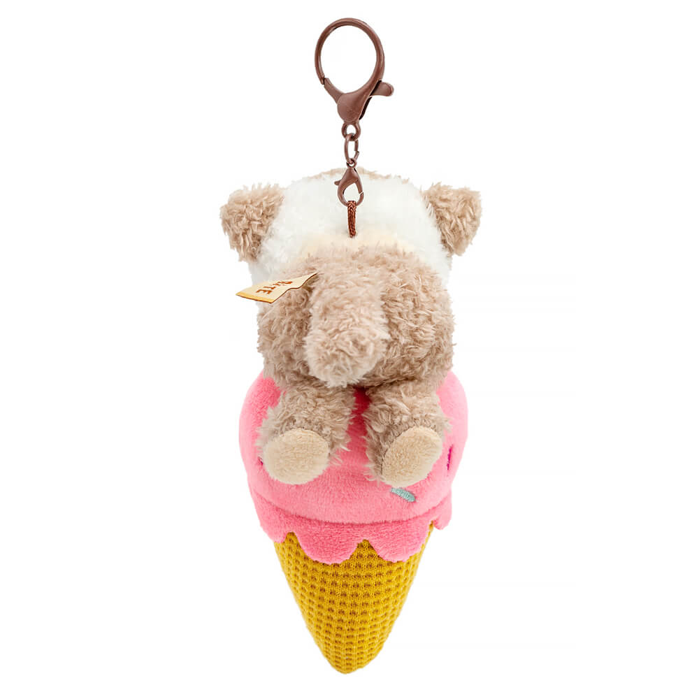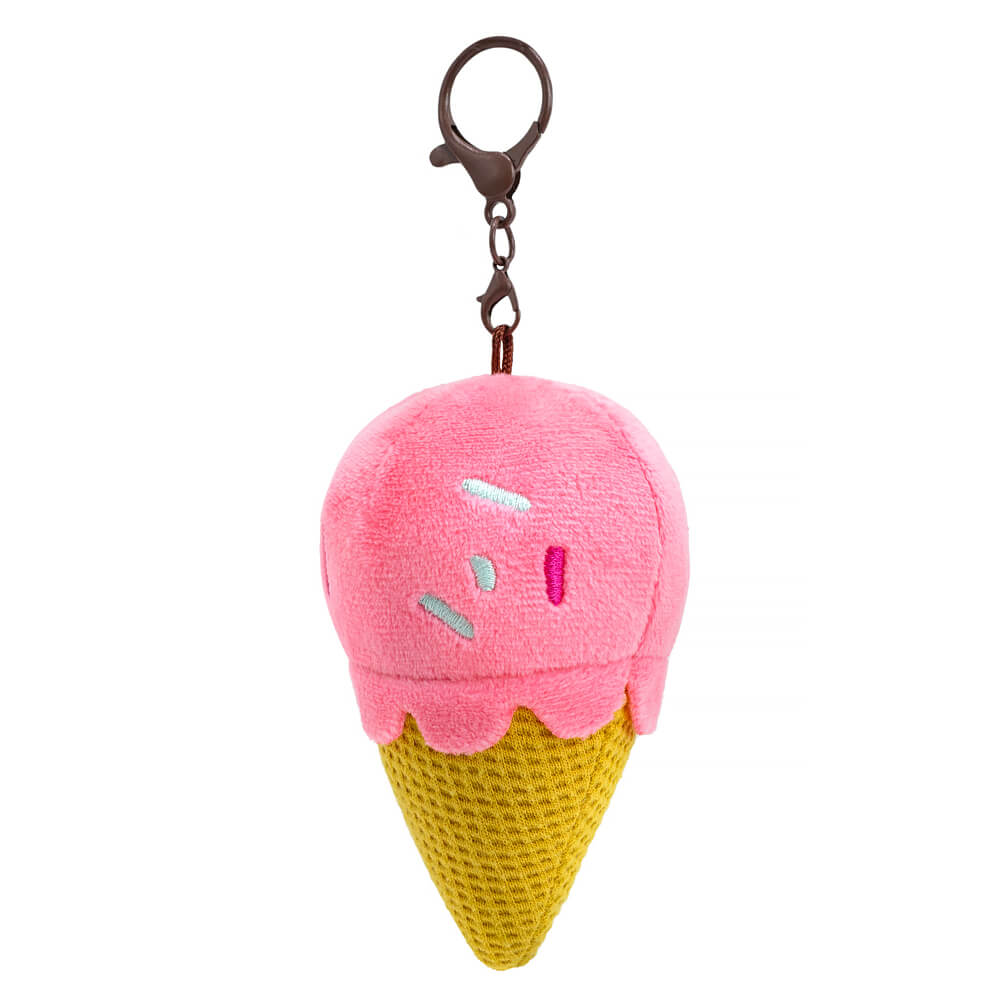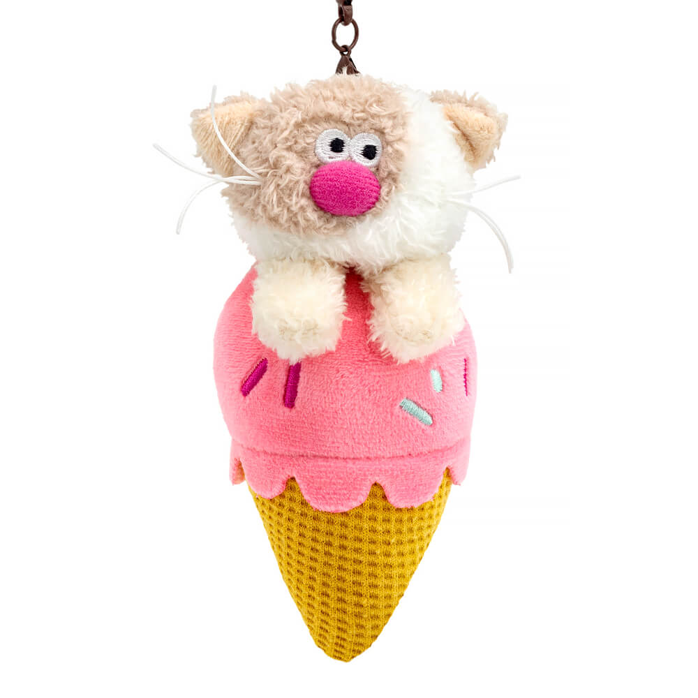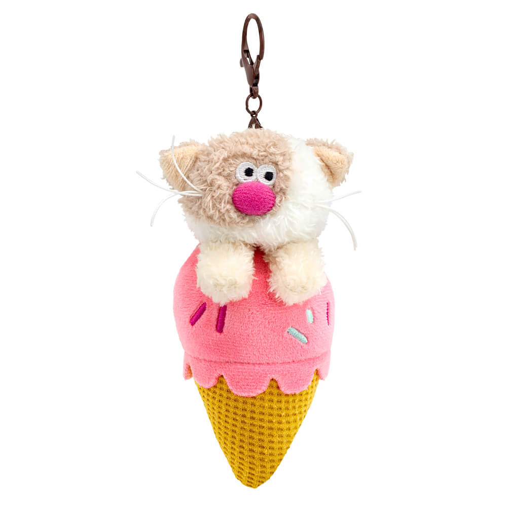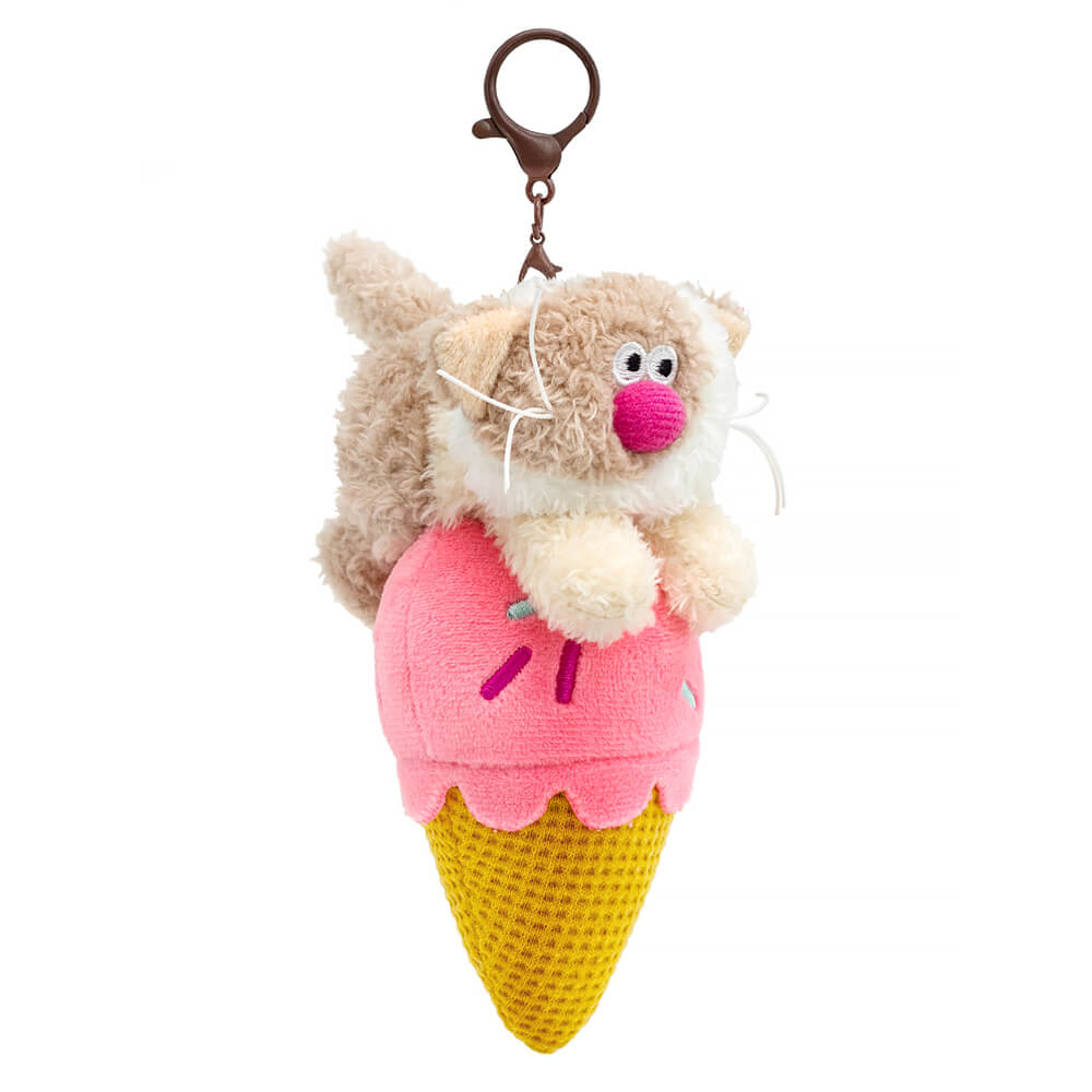 Забавный брелок в виде милого котёнка Латте из тактильно приятного эко меха в трёх оттенках: цвета молочного какао, цвета топлёного молока и белоснежного цвета молочной пенки. Котёнок удобно устроился на рожке клубничного мороженого. Мороженое сшито из вафельной ткани цвета печенья, имитирующей вафельный рожок, и софта цвета нежной клубники с вышитой карамельной посыпкой. У брелока удобный карабин шоколадного цвета с застежками, который можно отстегнуть.