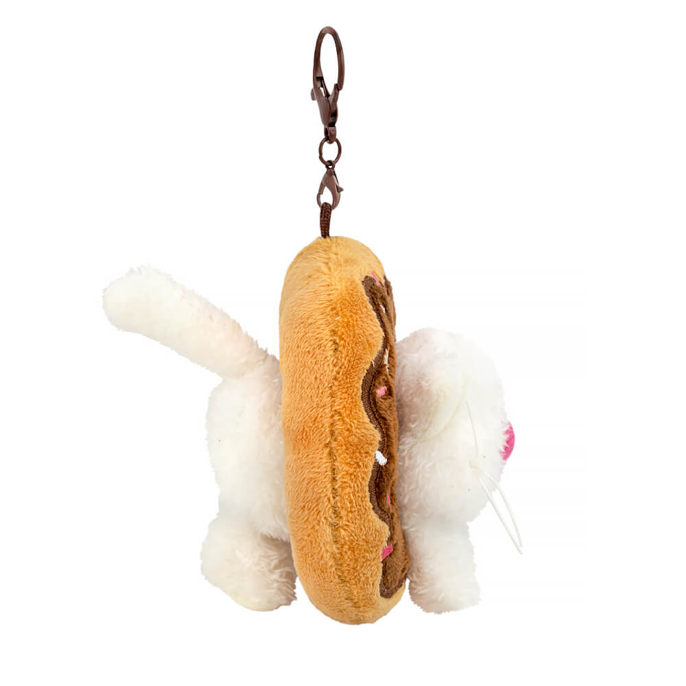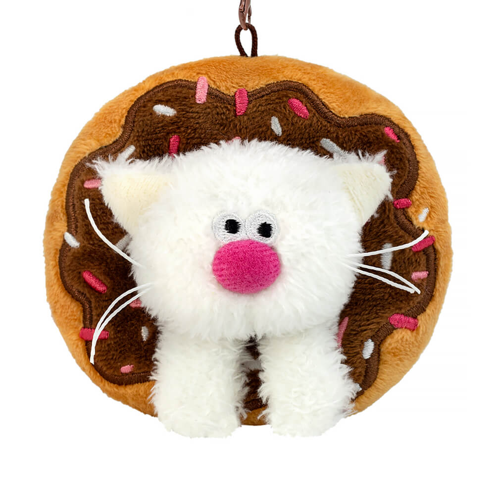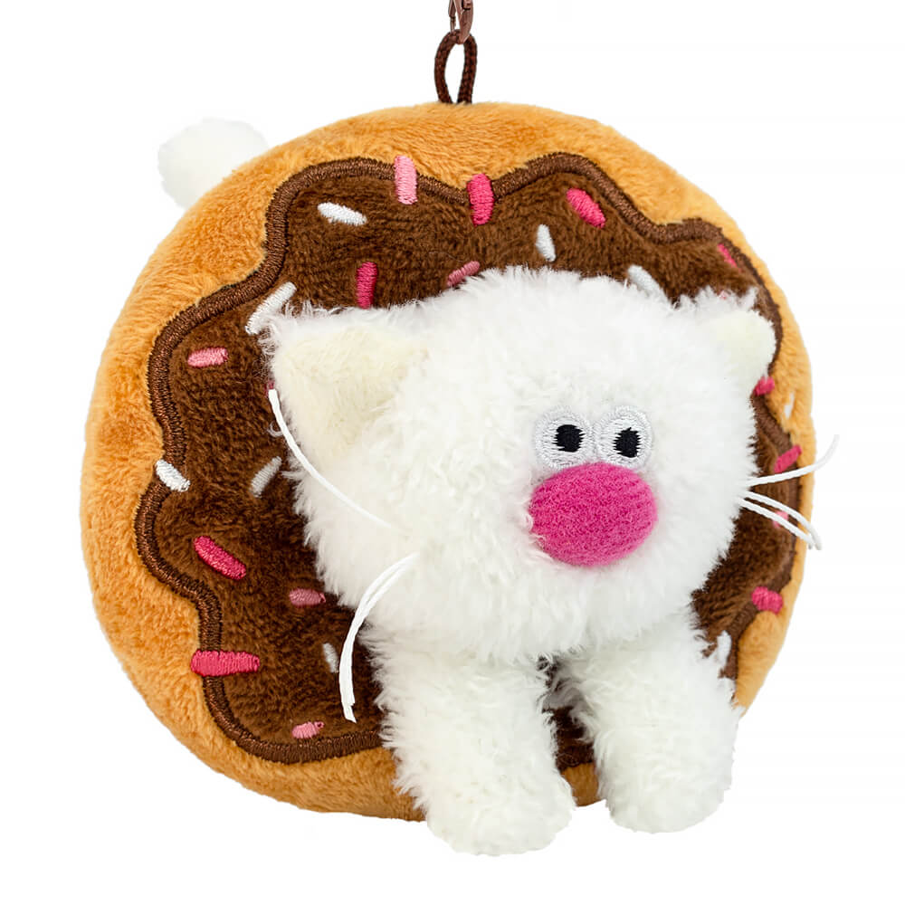 Забавный брелок в виде милого котёнка Молоко из тактильно приятного эко меха молочного цвета. Котёнок расположился в пышном пончике, сшитом из нежного софта. Сам пончик цвета выпечки, а сверху крем цвета горького шоколада с вышитой карамельной посыпкой. У брелока удобный карабин шоколадного цвета с застежками, который можно отстегнуть.