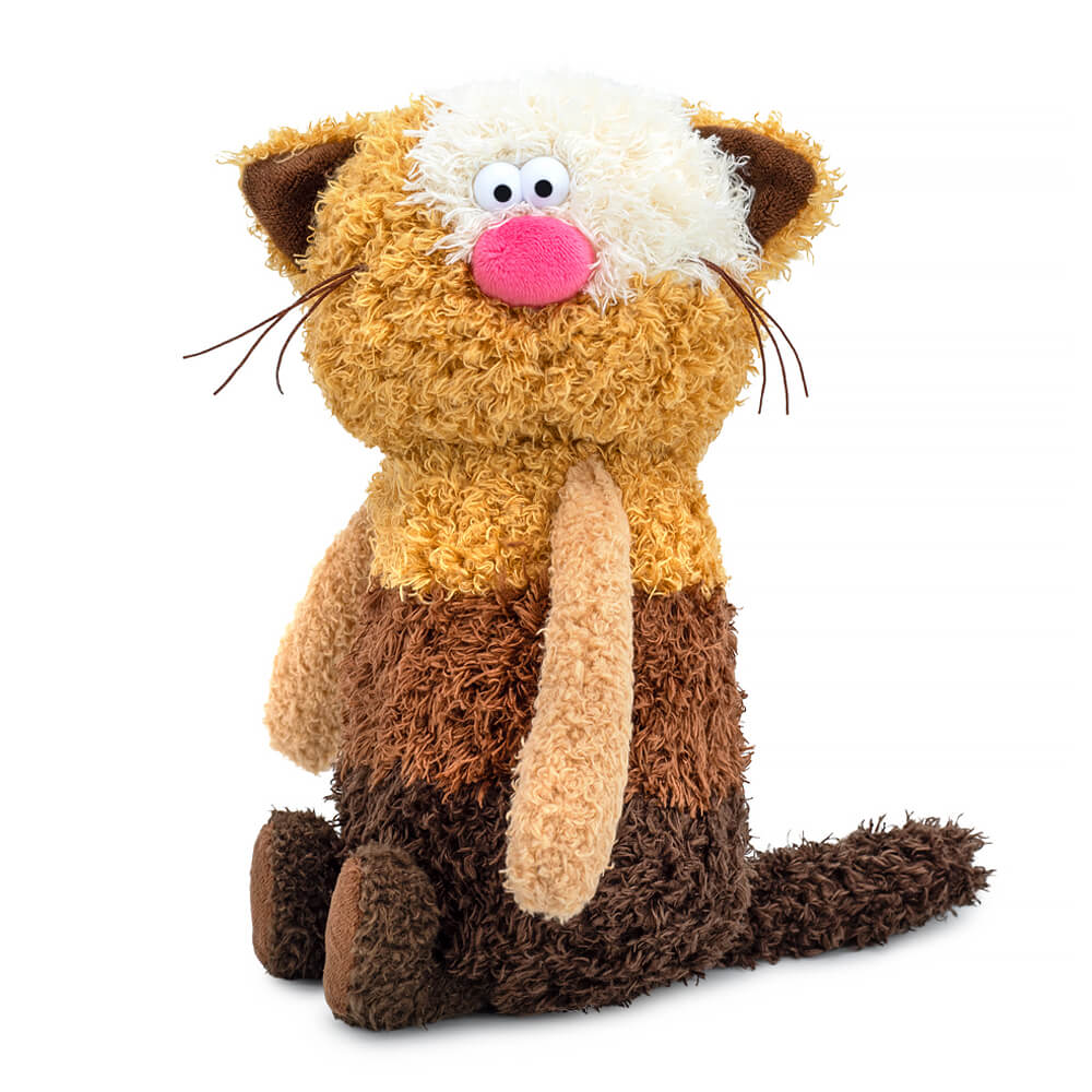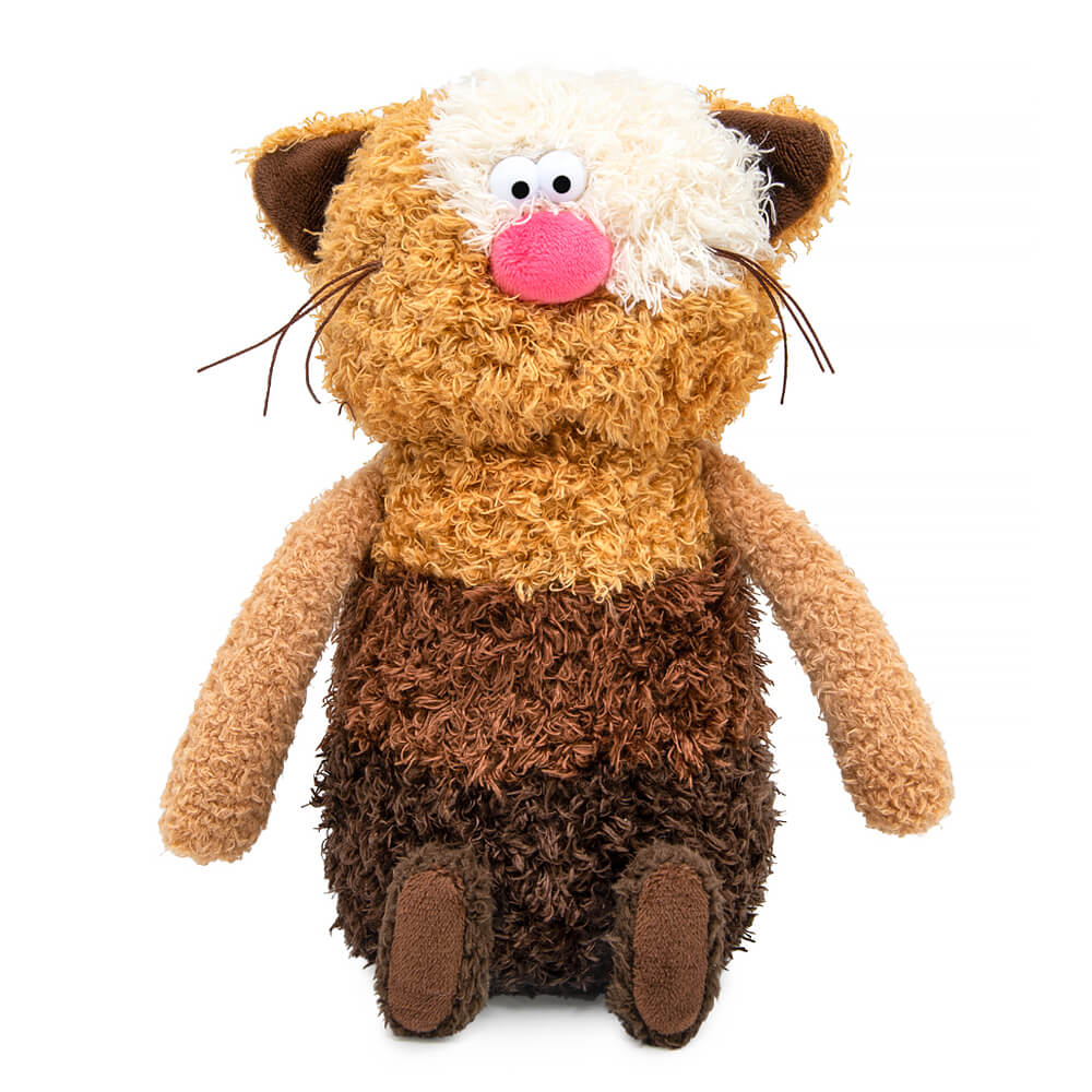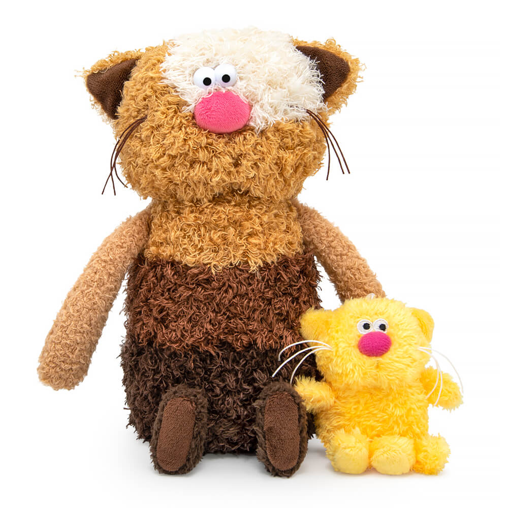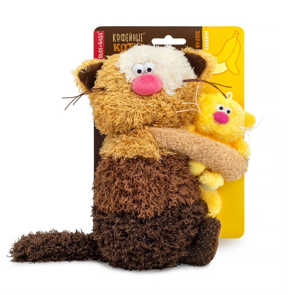 Шикарный кофейный кот Фраппе из тактильно приятного эко меха в трёх оттенках: цвета горького шоколада, цвета золотистой карамели и белоснежного цвета молочной пенки. У кота есть дружок – сиропчик-котёнок Банан. Ведь так вкуснее! Котик Фраппе трогательно держит в лапках малыша Банана, сшитого из эко меха цвета спелого банана.