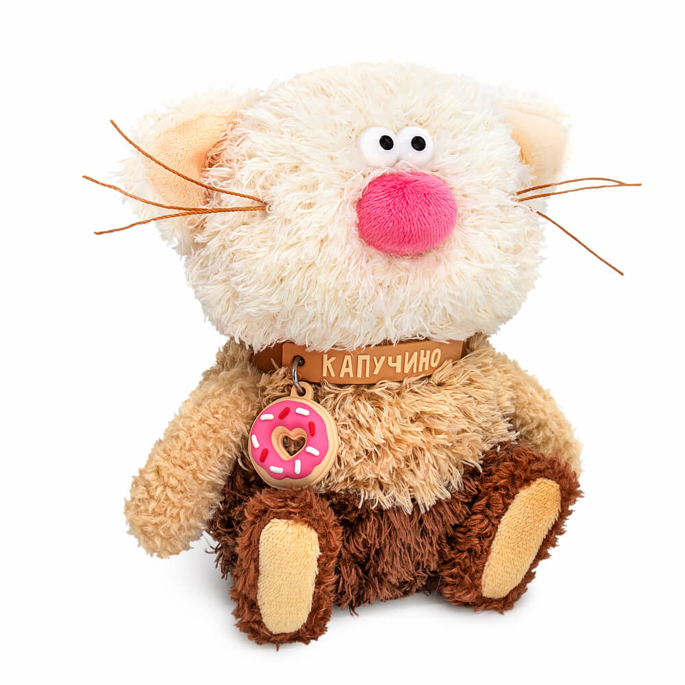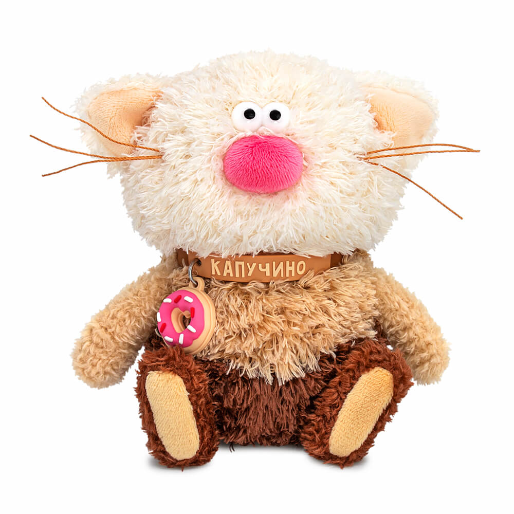 Шикарный кот Капучино из тактильно приятного эко меха в трех оттенках: шоколадного, кремового и молочного цвета в миниатюрном размере 12 см. Лапки и хвостик из более короткого меха. Усики из шелковистого крученого шнура. Объемный носик обтянут розовым софтом. Глазки из пластика. Пяточки из софта цвета крема, а внутри ушек софт сливочного цвета. На шейке у кота силиконовый чокер с названием и небольшим подвесом в виде пончика с розовой помадкой.