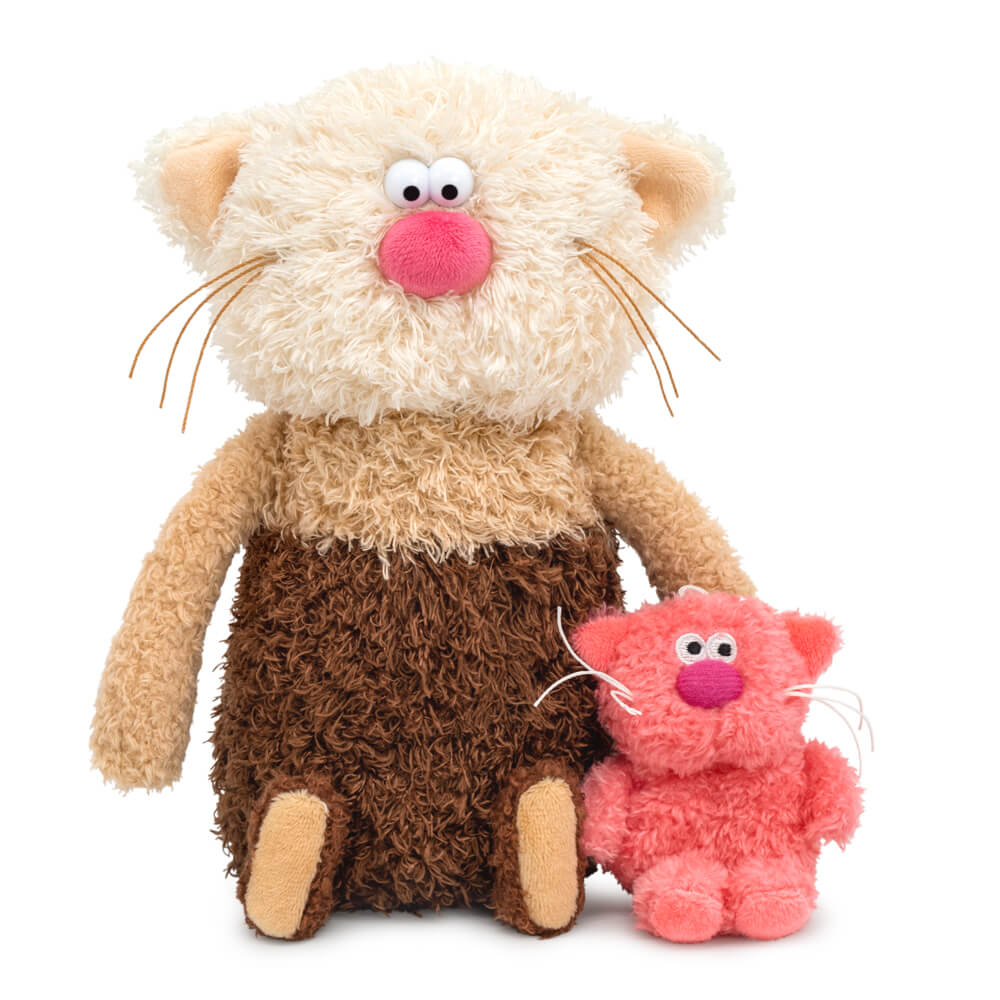 Шикарный кофейный кот Капучино из тактильно приятного эко меха в трёх оттенках: шоколадного, кремового и молочного цветов. У кота есть дружок – сиропчик-котёнок Клубника. Ведь так вкуснее! Котик Капучино трогательно держит в лапках малыша Клубнику, сшитого из эко меха цвета нежной клубники.