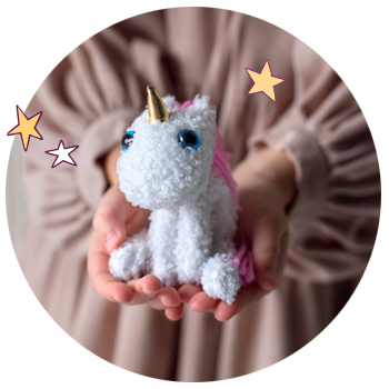 Мягкая игрушка единорог Пудинг с голубыми глазками, шерсткой из кипенно‑белого буклированного трикотажа, гривой и хвостом из розовой пряжи, рогом из болоньевой ткани с золотистым напылением. Верный друг куколки Авроры.