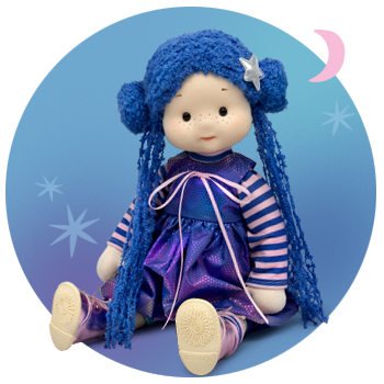 Текстильная кукла с волосами из буклированной пряжи викторианского синего цвета. Волосы убраны в два милых бублика с длинными прядями. В волосах Лив звёздочка из серебряной экокожи, спаянная по краям.