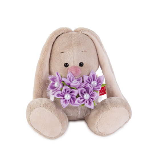 У Зайки в лапках нежный букетик лиловых цветов из шелковистого сатина. В серединке каждого цветка белая жемчужина. Букетик обёрнут в беленькую сеточку.