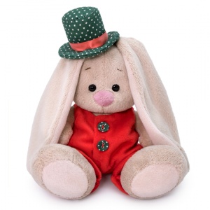 Малыш в забавном комбинезончике яркого красного цвета, сшитого из мягкого софта, с застёжкой спереди на пуговки, обтянутые зелёной тканью в белый горошек. Из такой же ткани выполнена вручную высокая шляпка, которую украшает атласная алая ленточка с бантиком.