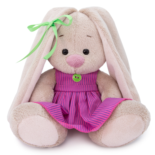 Симпатичное платье из х/б ткани в тонкую полосочку, спереди платье украшает зелёная пуговка. На ушке у Зайки бантик из ленты цвета свежей травы.