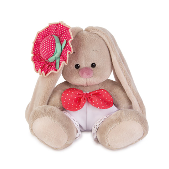 Зайка в беленьких панталончиках из х/б ткани, украшенных хлопковым кружевом и мягким бантом из кораллового ситца в белый горошек. На ушке у Зайки маленькая шляпка из алого ситца в горошек. По кругу на шляпке атласная ленточка, завязанная в бант мятного цвета.