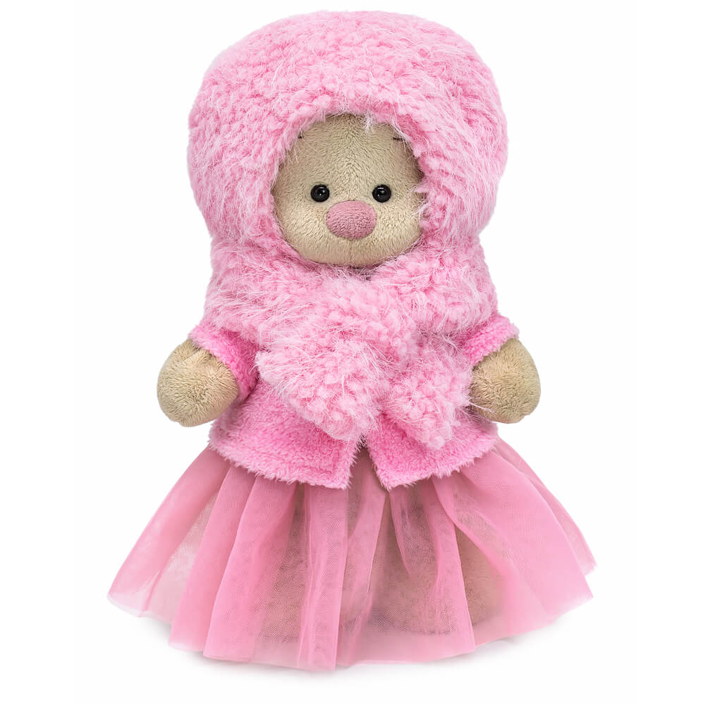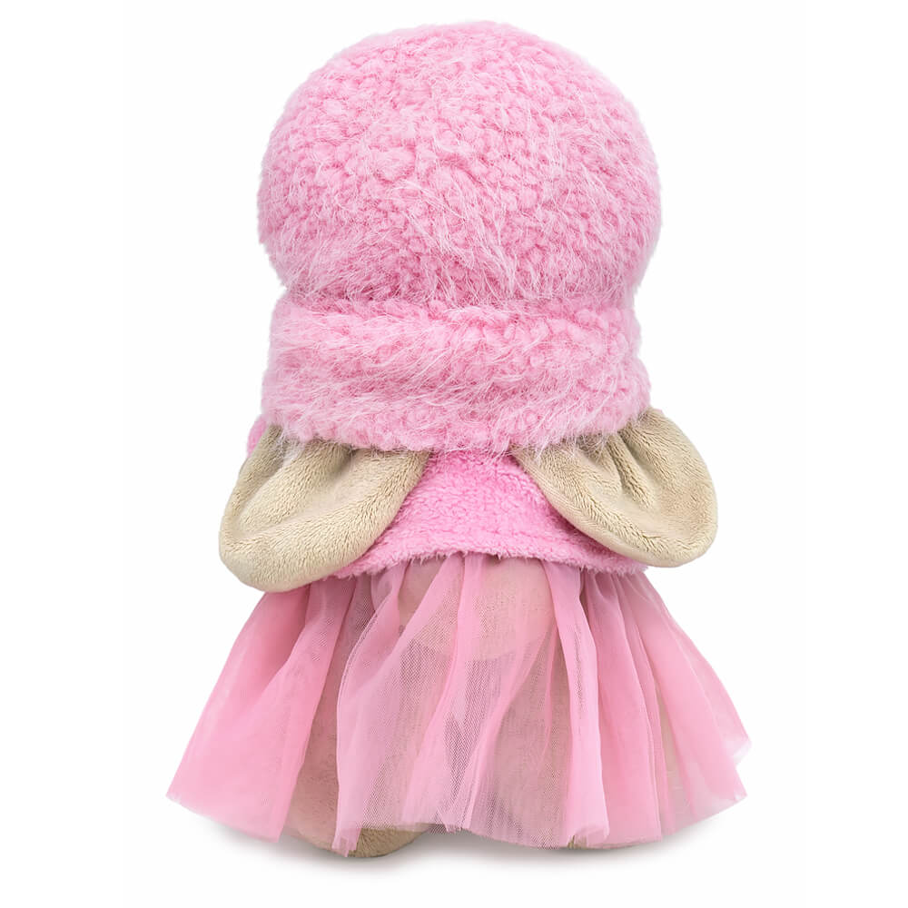 Зайка Ми в невероятно нежном костюмчике в розовых оттенках. На Зайке объёмная шапочка на подкладе и шарф-петля из шерстяного экомеха цвета розовой воды. В комплекте мягкая курточка из короткого меха и широкая юбка из тафты.