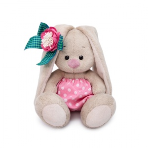 Малышка Зайка в трогательных коротких розовых штанишках в белый горох. На ушке аксессуар в виде ярко-розовой камелии с бантом из бирюзовой ленты в мелкую синюю клеточку.