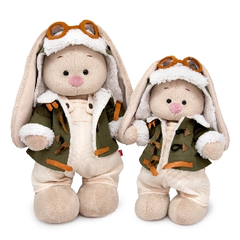 Курточка-пилот из искусственной замши цвета «хаки» на меху с оригинальными пуговицами под кость. В комплекте – лётный шлем с защитными очками и комбинезончик из бежевого вельвета.