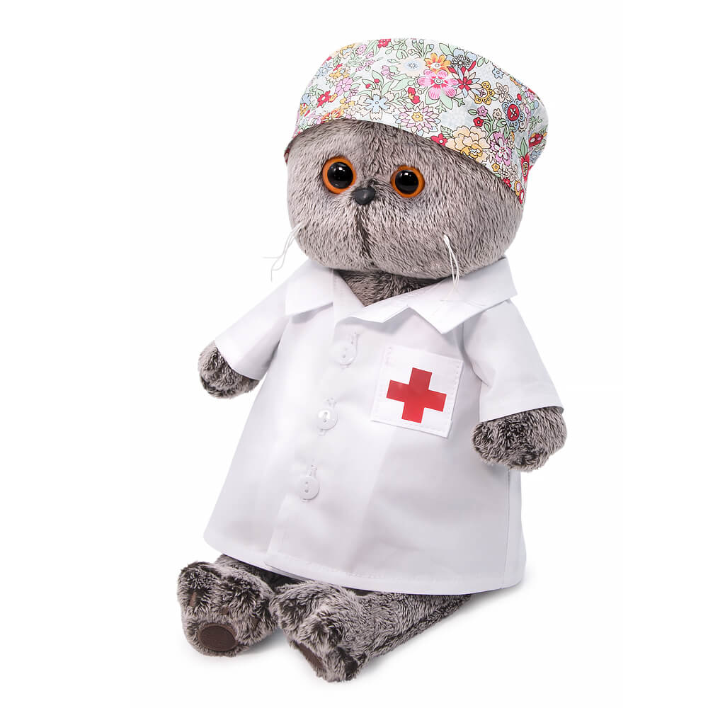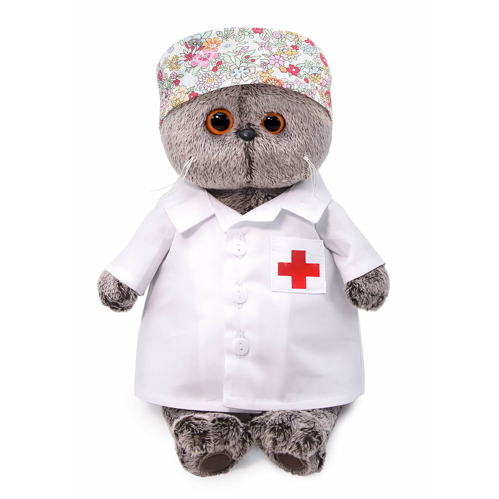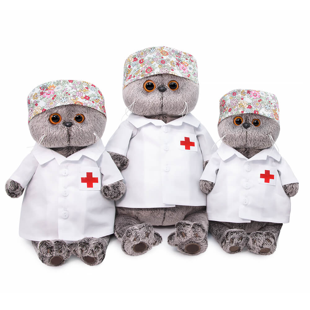 Кот в костюме врача, белоснежном халате с красным крестом на нагрудном кармашке и докторской шапочке из цветного хлопка на резиночке сзади.