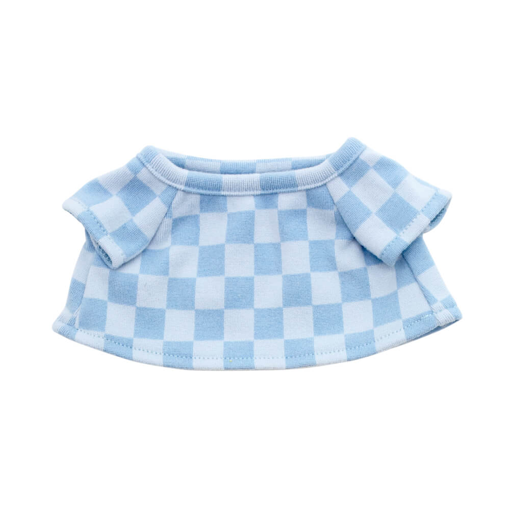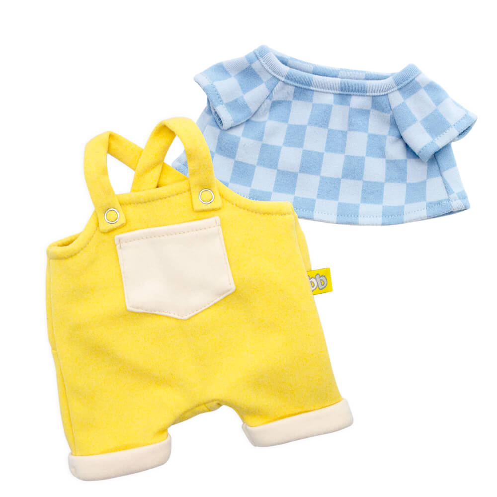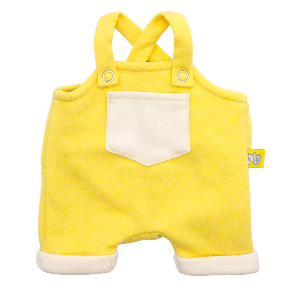 Милый комбинезон на лямках, сшитый из двустороннего бархатистого трикотажа цвета желтка, с карманом спереди. Также нежно-голубой лонгслив из плотного мягкого трикотажа.