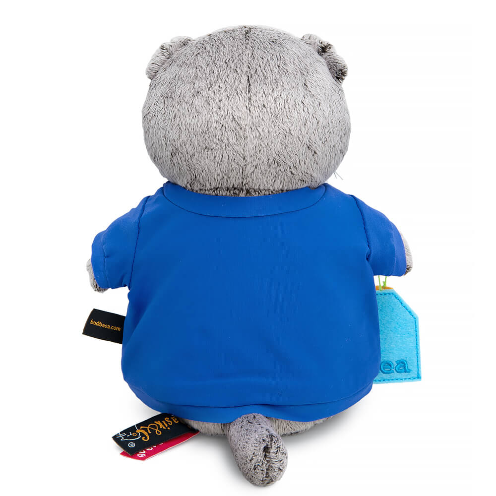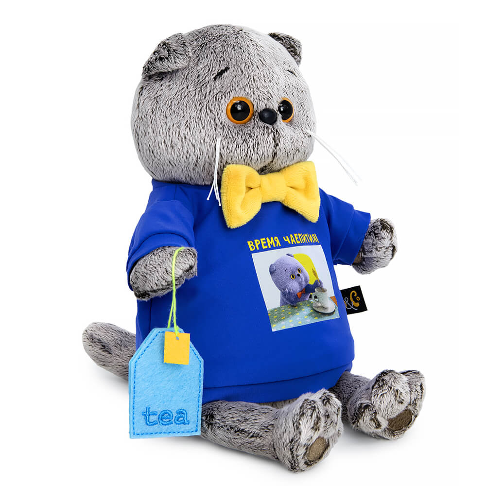 Кот Басик в трикотажном свитшоте цвета электрик. Спереди на свитшоте принт - кадр из мультсериала с надписью «Время чаепития!». В лапке у Басика чайный пакетик, выполненный вручную из фетра. Также на Басике его фирменный галстук-бабочка. Кот представлен в фирменной коробке с дизайном в стиле мультсериала «Кот Басик».