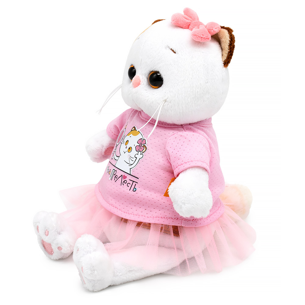 Кошечка Ли-Ли в классной футболке из спортивного трикотажа цвета розовой карамели. Спереди футболка украшена авторским принтом с надписью «Просто прелесть». Также на Ли-Ли пышная юбочка из розового фатина. На ушке розовый бантик из софта. Кошечка Ли-Ли представлена в фирменной коробке с дизайном в стиле мультсериала «Кот Басик».