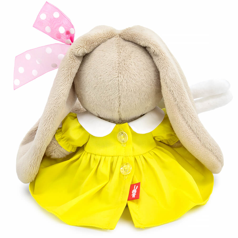 Малышка Зайка Ми в милом платье, цвета одуванчика. Платье сшито отрезным по талии, с рукавом фонарик и отложным белоснежным воротничком. На ушке у Зайки нежный бант из розовой органзы в белый горошек. В лапках Зайка держит трогательную игрушку, беленького зайчика из софта с розовым бантиком.